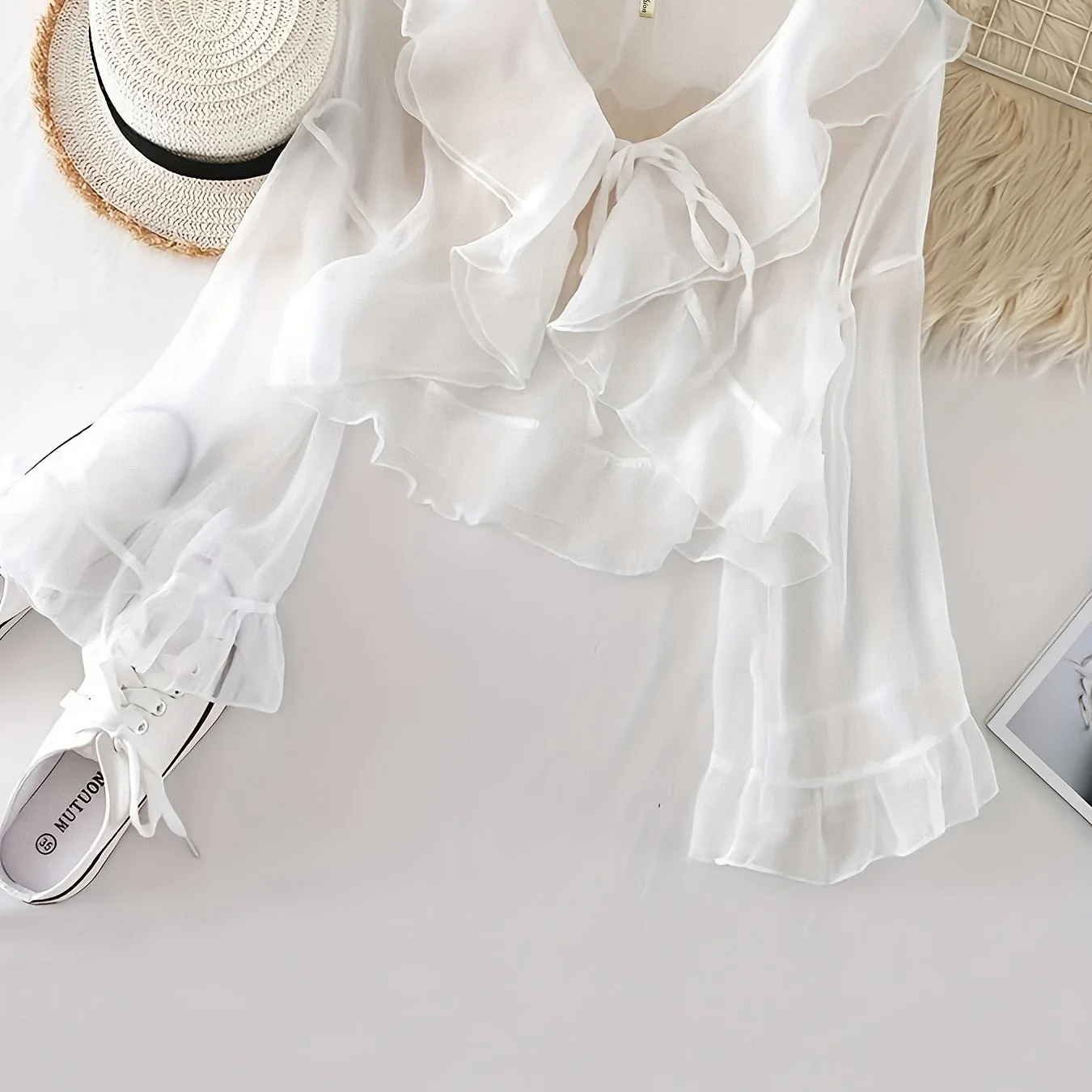 Ruffle Layered Blouse, Elegant Tie Front Long Flared Sleeve Blouse, Women's Clothing