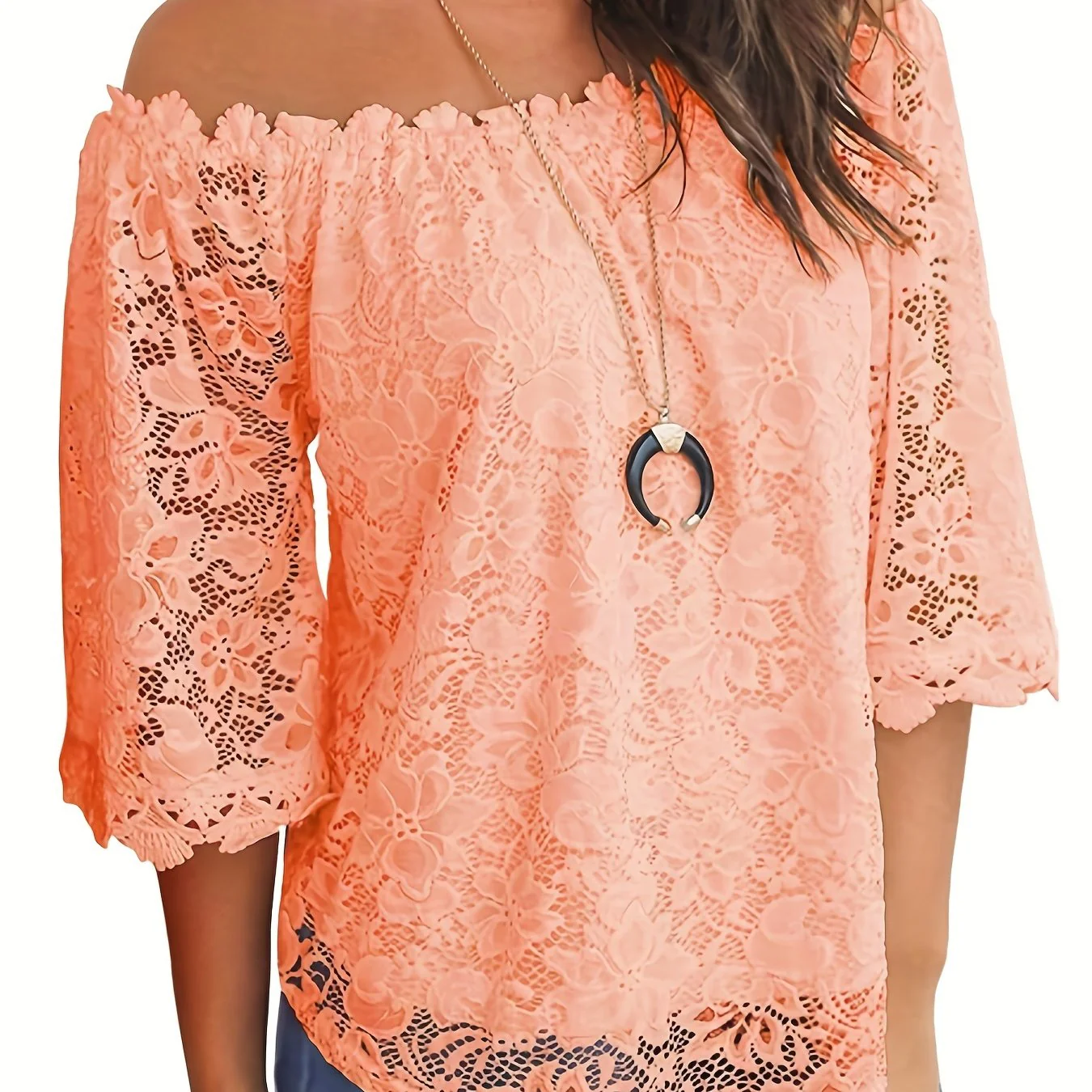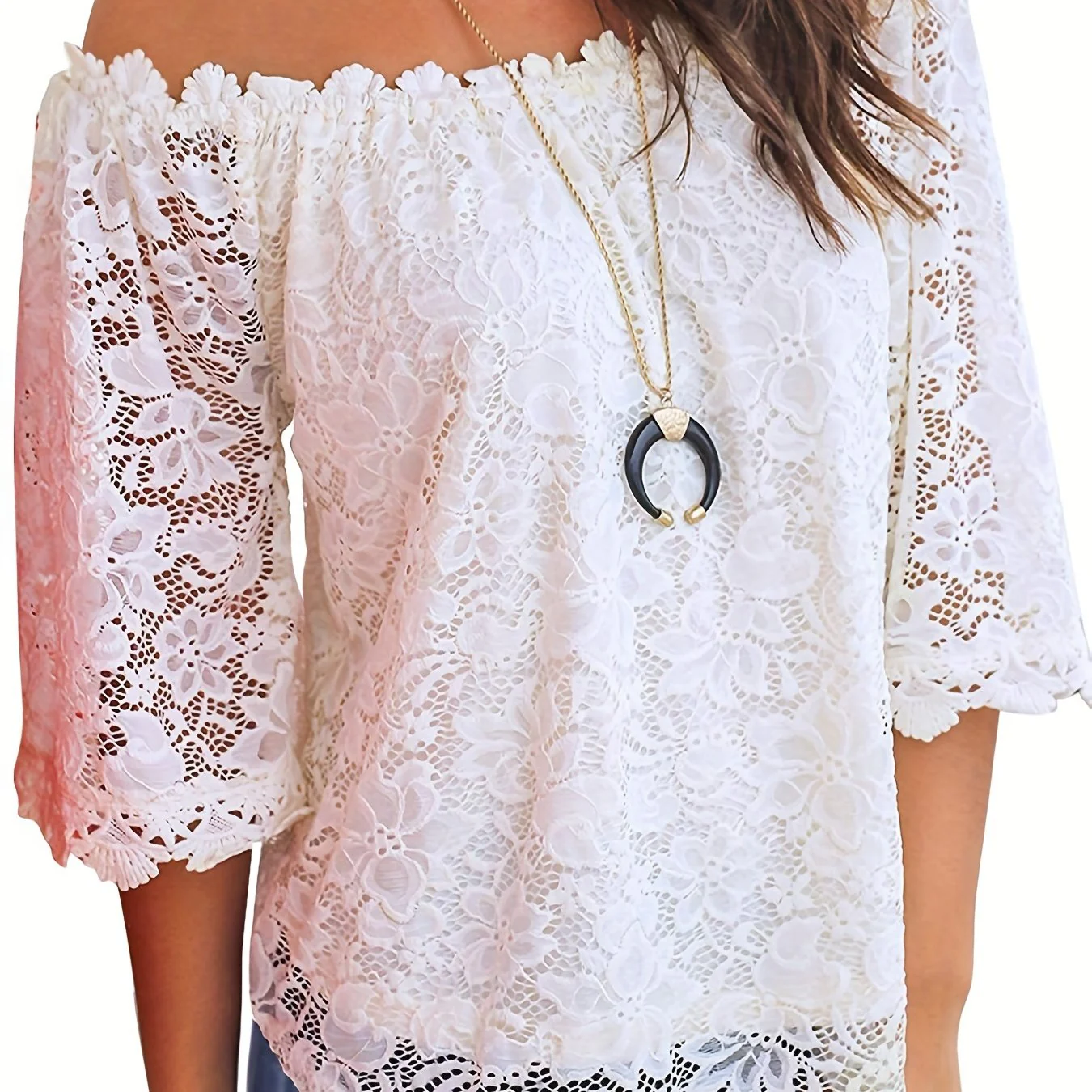 Floral Lace Off Shoulder Blouse, Elegant 3/4 Sleeve Blouse For Spring & Summer, Women's Clothing