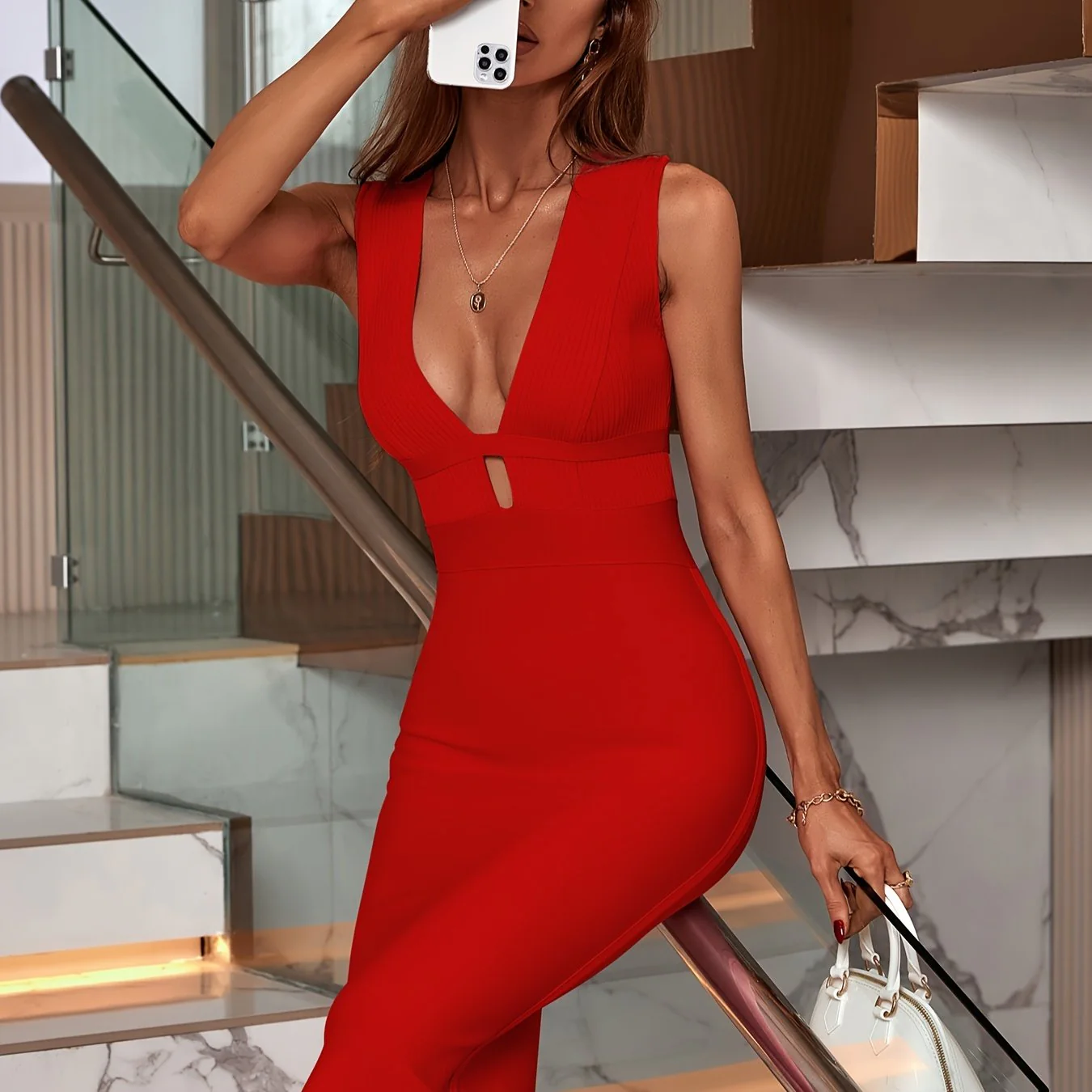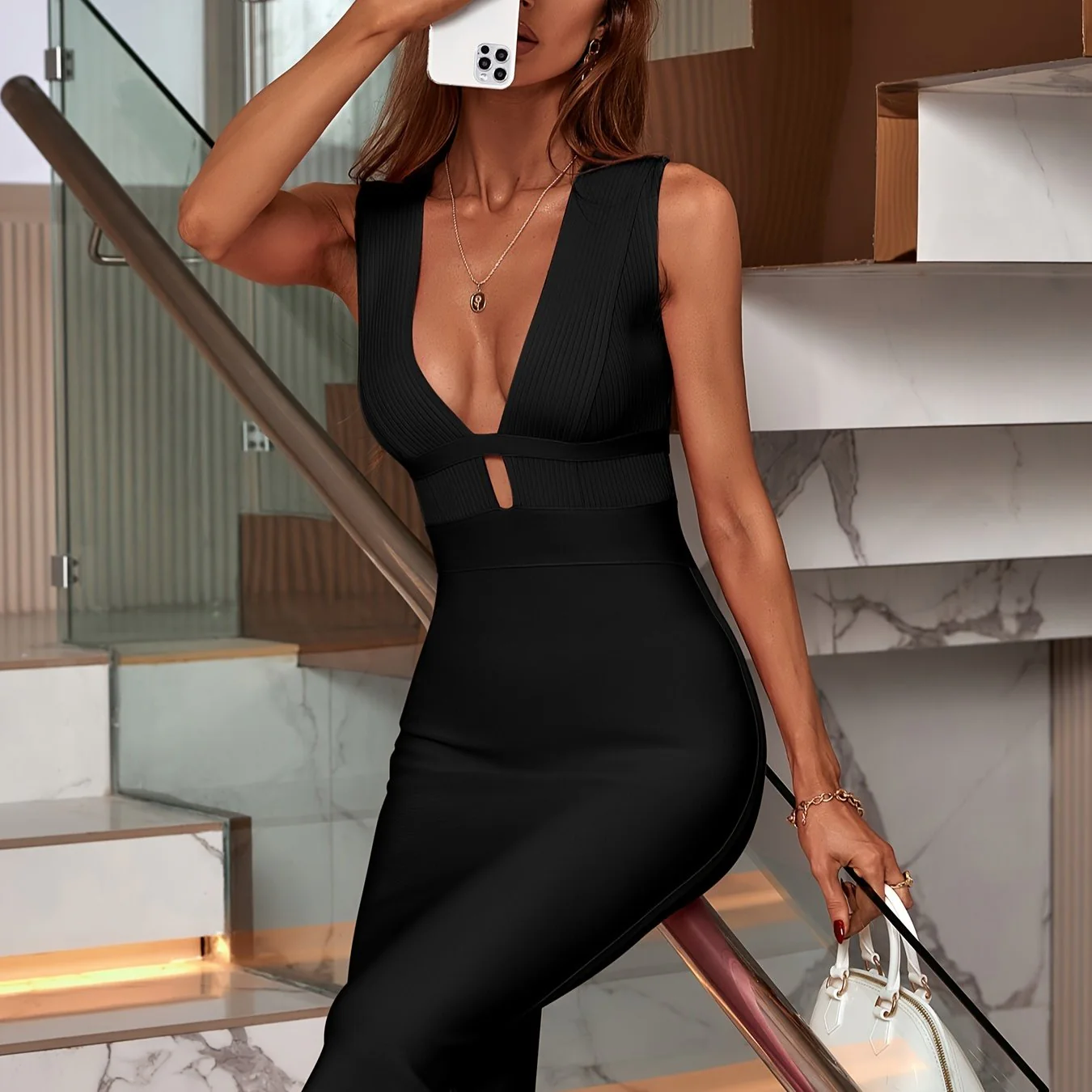 Plunging Backless Solid Dress, Party Wear Bodycon Sleeveless Dress, Women's Clothing