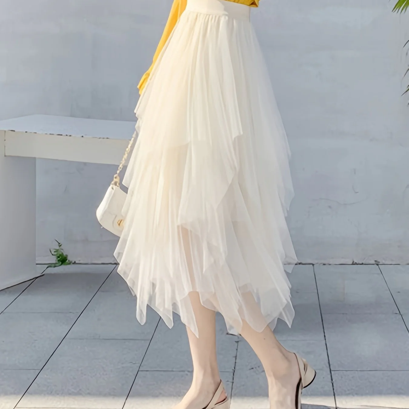 Hanky Hem Lace Tiered Skirt, High Waist Mid Calf Skirt For Spring & Summer, Women's Clothing