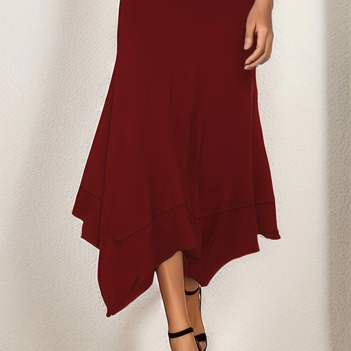Plus Size Elegant Skirt, Women's Plus Solid High Rise Medium Stretch Asymmetric Hem Skirt