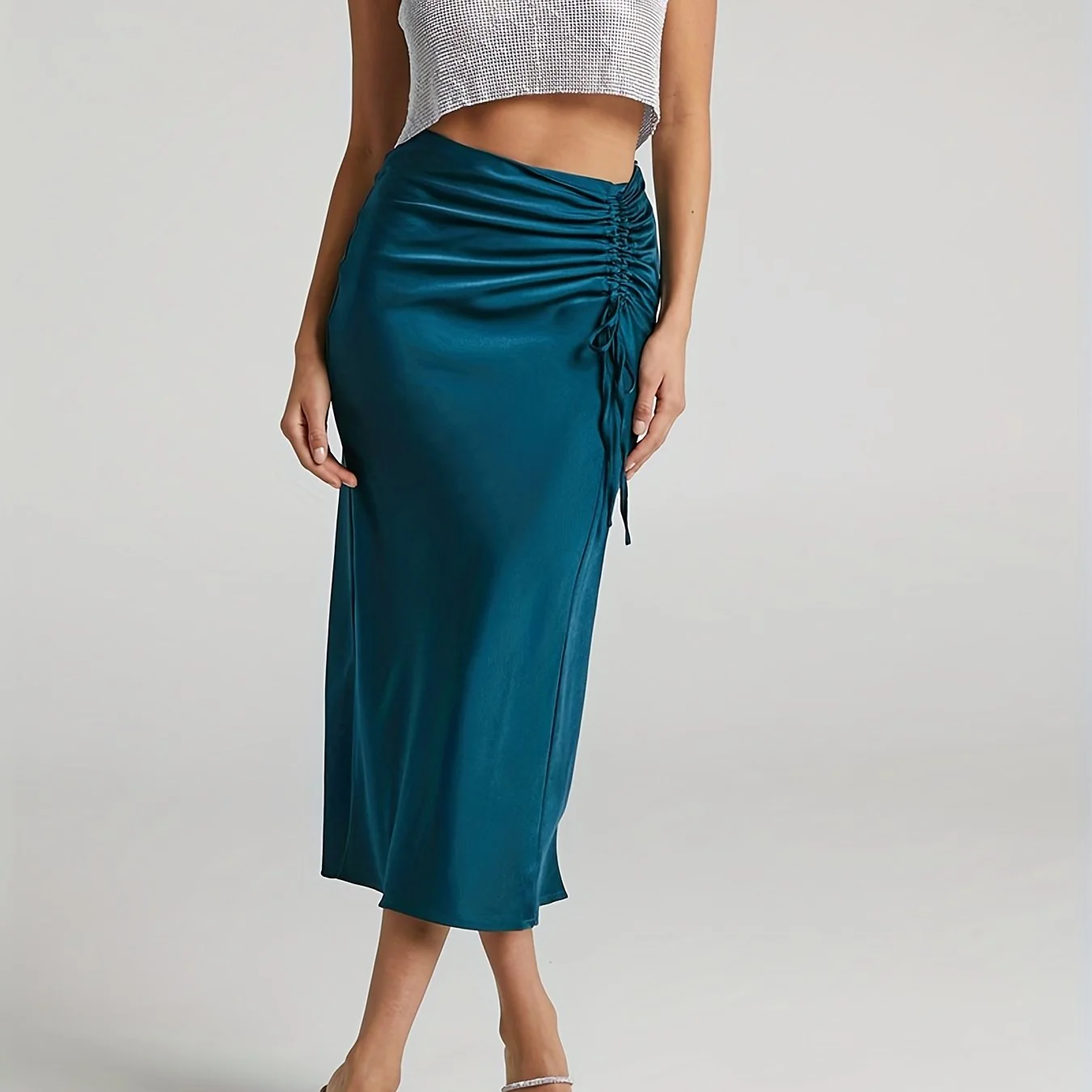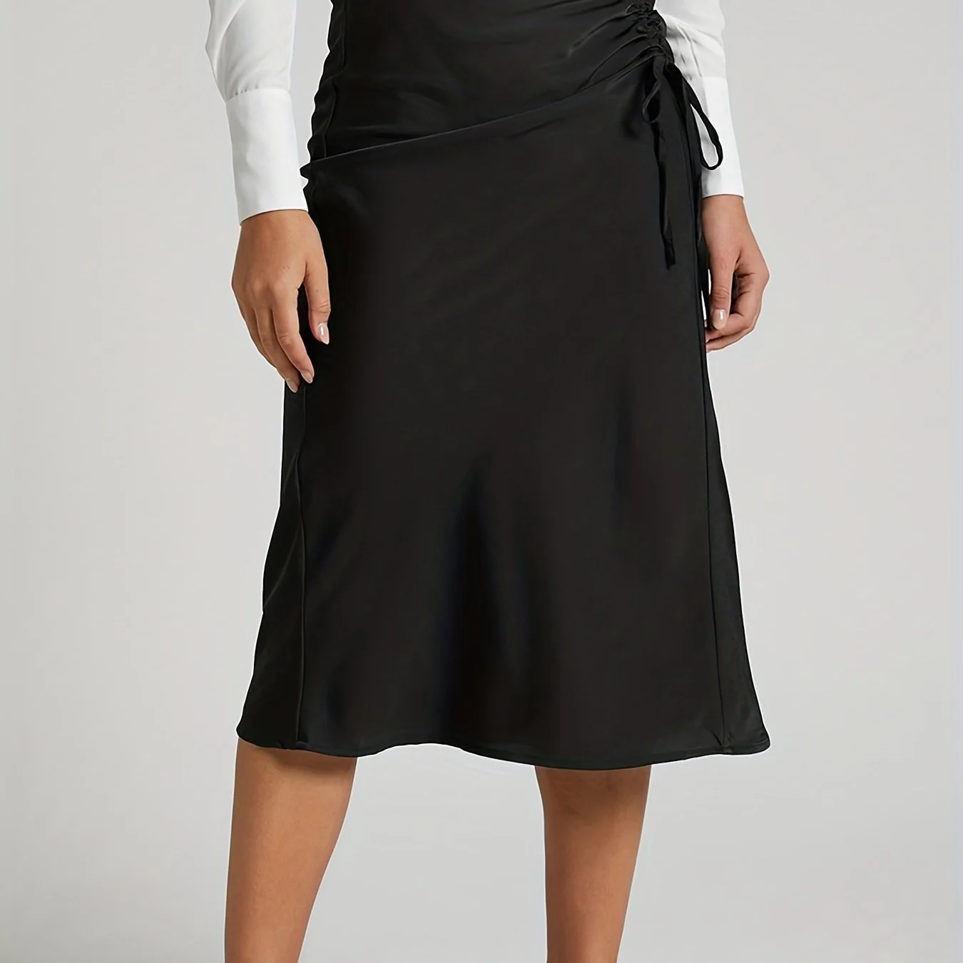 Solid Drawstring Ruched Skirt, Casual High Waist Skirt For Spring & Summer, Women's Clothing
