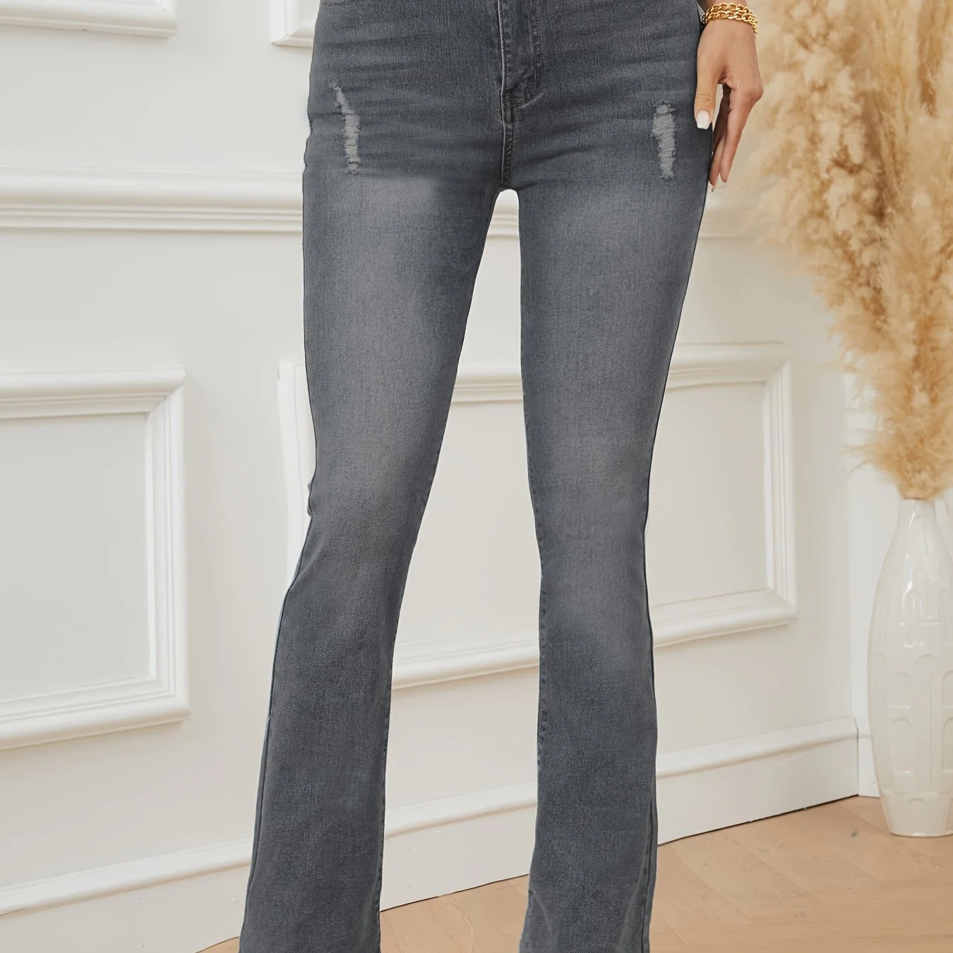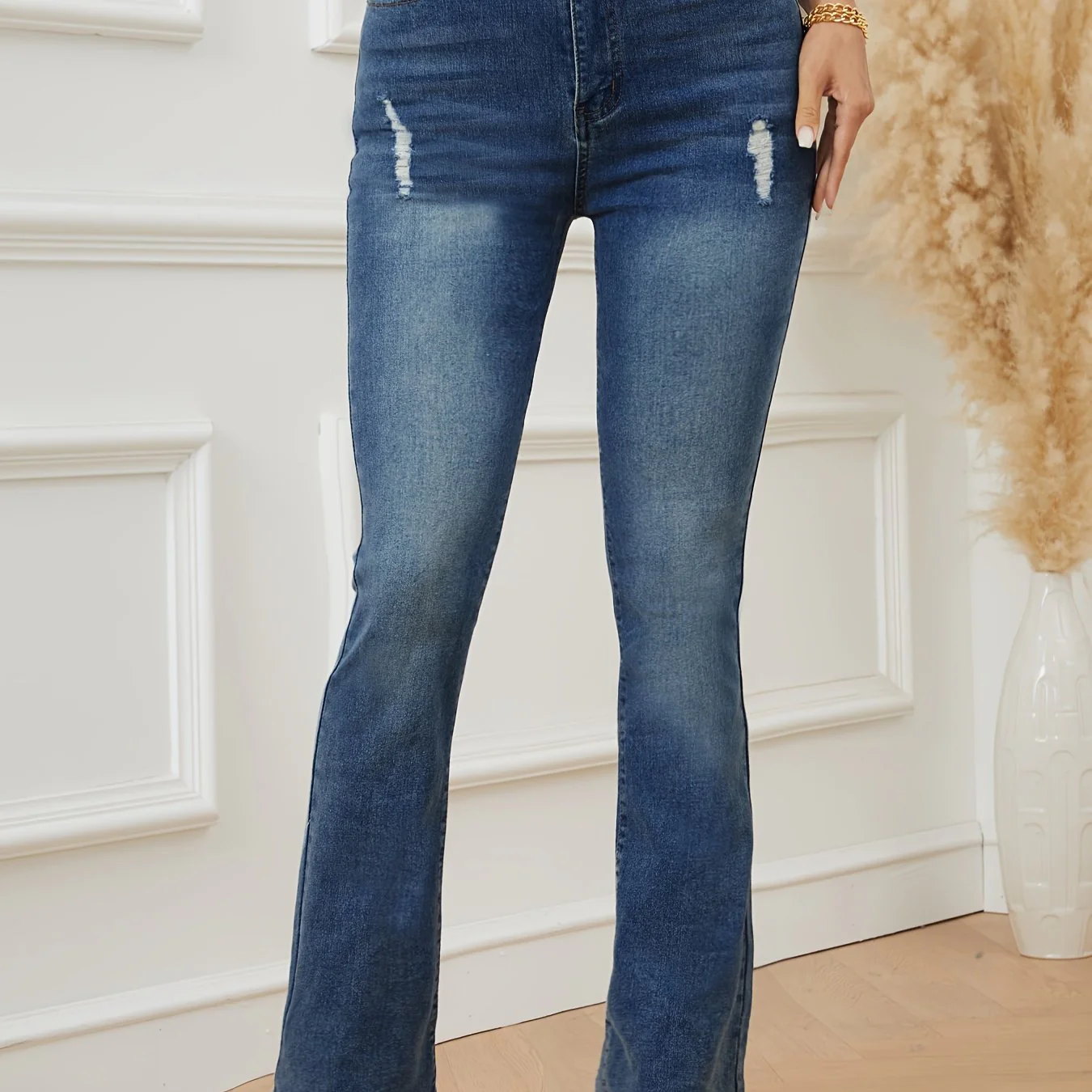 Plain Ripped Holes Bootcut Jeans, High-Stretch Slant Pockets Slim Fit Denim Pants, Women's Denim Jeans & Clothing