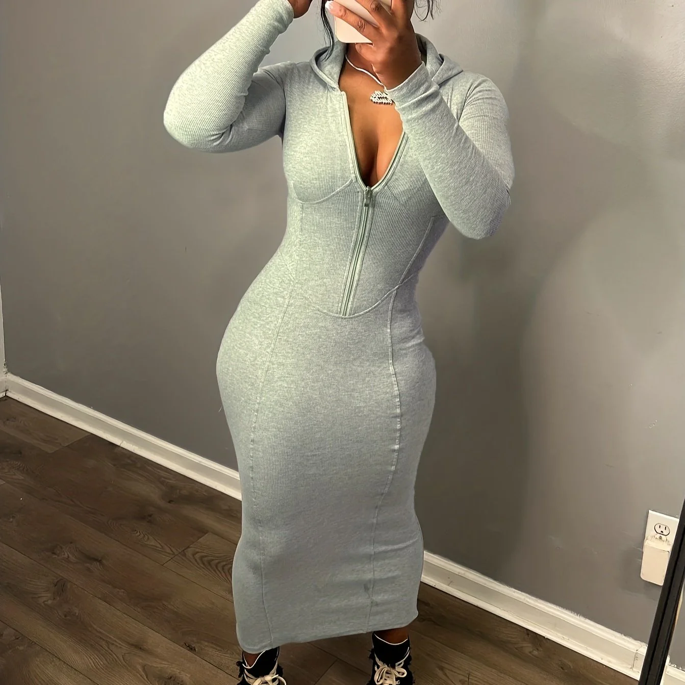 deanwangkt-1 Zip Front Bodycon Hooded Dress, Casual Long Sleeve Ankle Length Dress For Spring & Fall, Women's Clothing