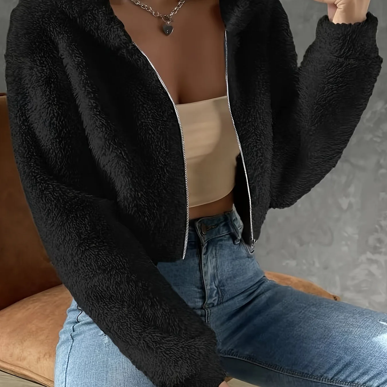 deanwangkt-1 Solid Zipper Hooded Crop Coat, Casual Faux Fur Thermal Coat, Women's Clothing