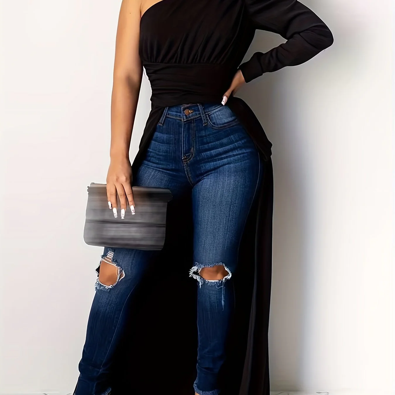 deanwangkt-1 One Shoulder High Low Hem Top, Sexy Asymmetrical Neck Top, Women's Clothing