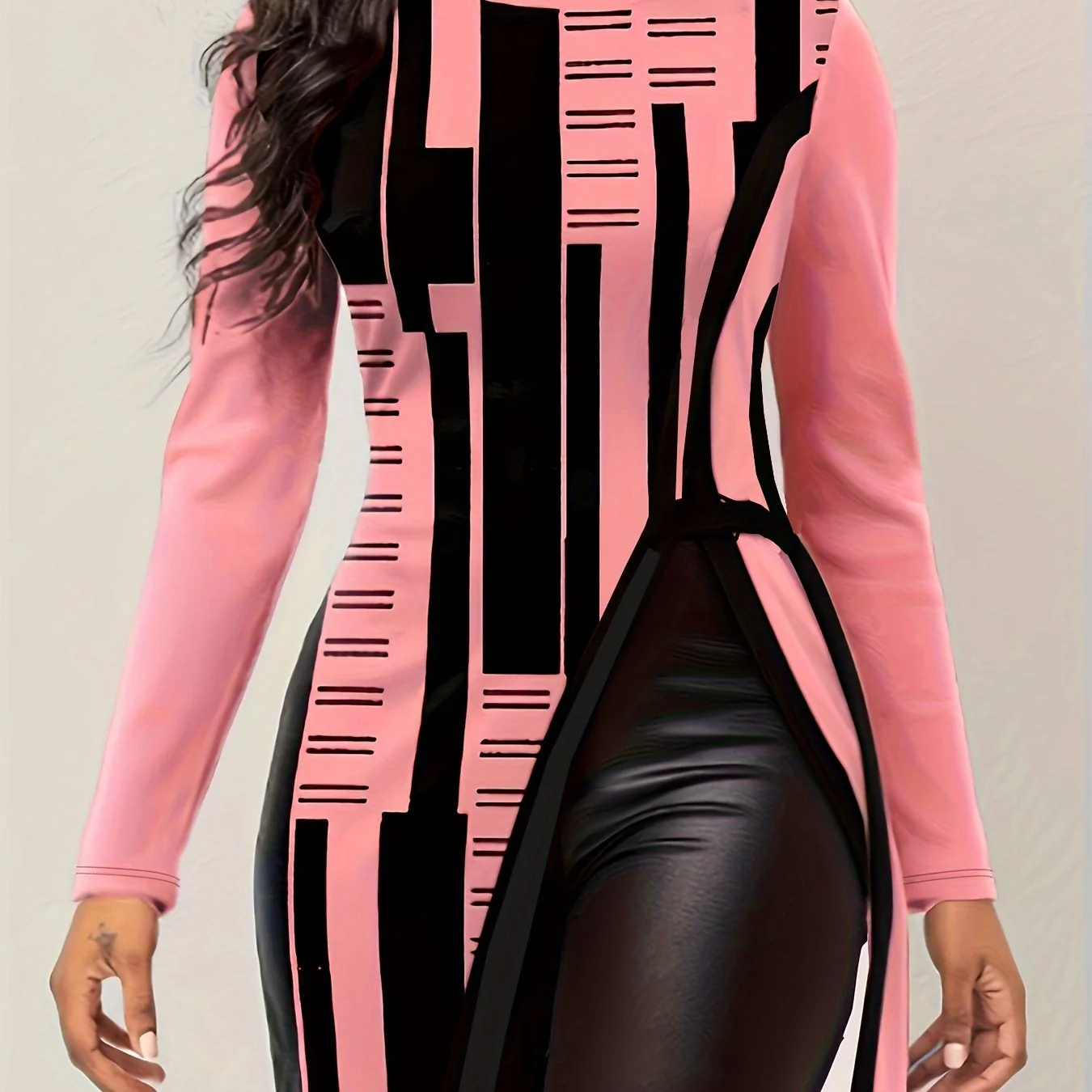 deanwangkt-1 Geometric Print Split Hem Top, Casual Crew Neck Long Sleeve Top For Spring & Fall, Women's Clothing