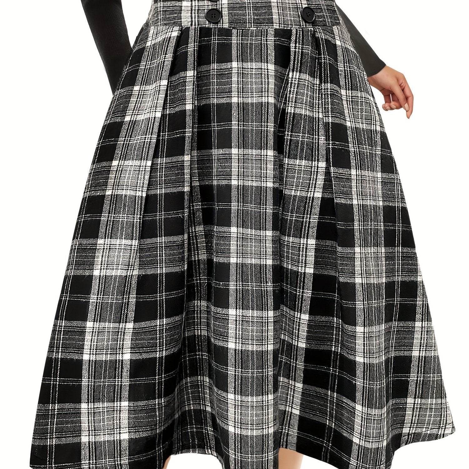 deanwangkt-1 Plaid Print High Waist Button Skirt, Elegant A Line Flare Midi Skirt, Women's Clothing