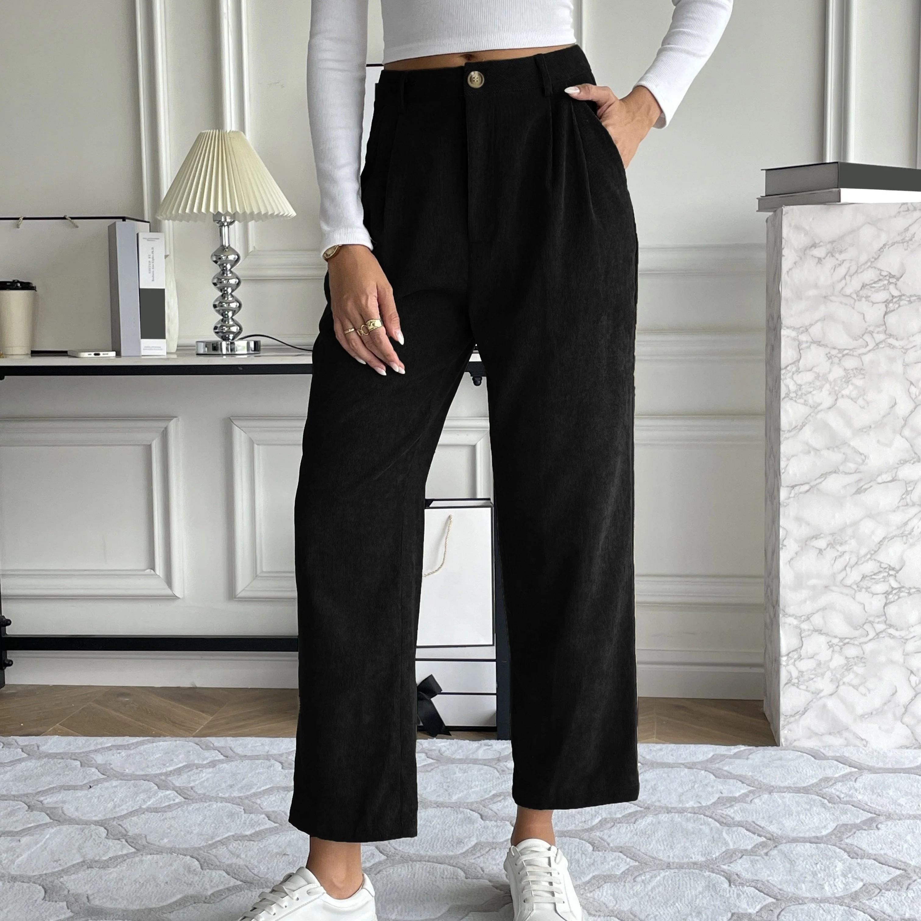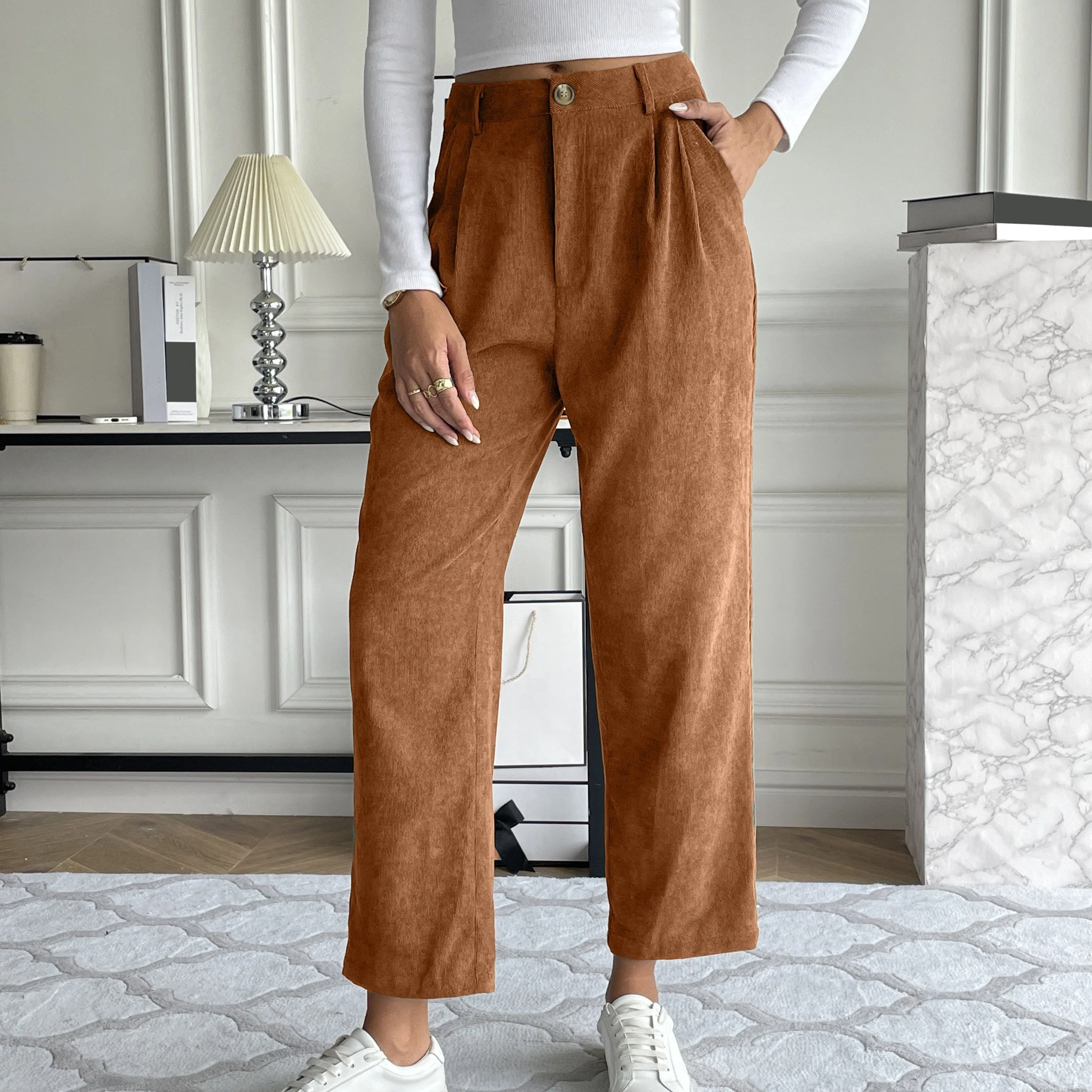 deanwangkt-1 Corduroy Pocket Straight Leg Pants, Casual Loose High Waist Pants, Women's Clothing