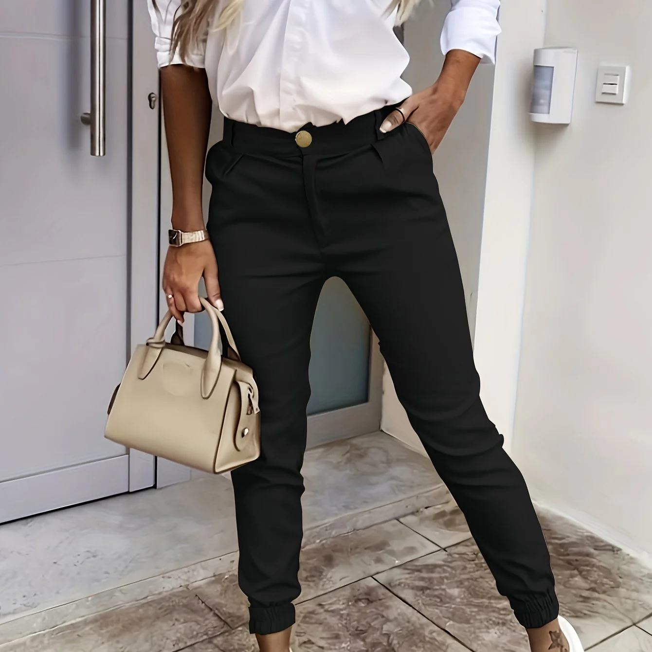deanwangkt-1 Slant Pocket Shirred Tapered Pants, Casual Slim Pants For Spring & Fall, Women's Clothing