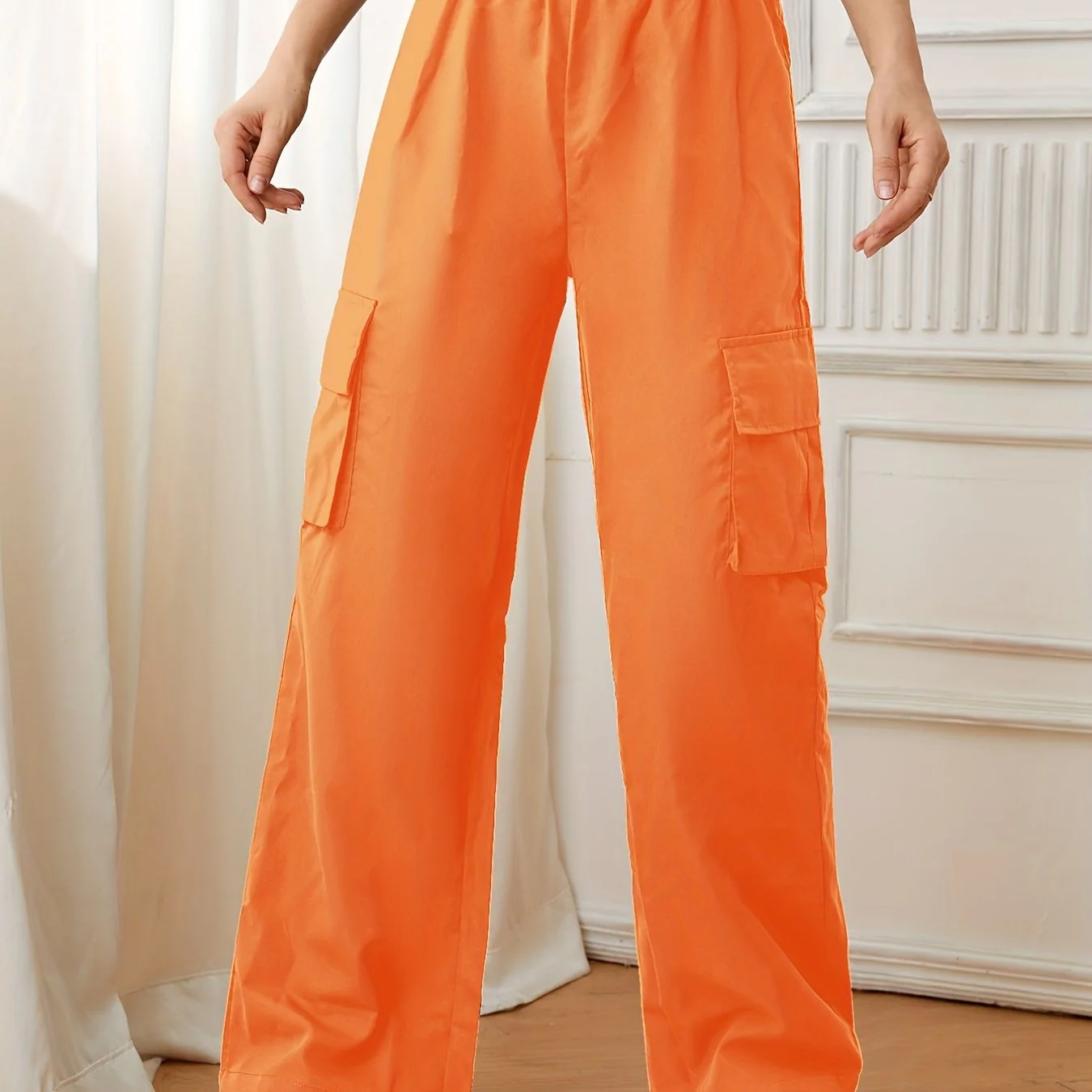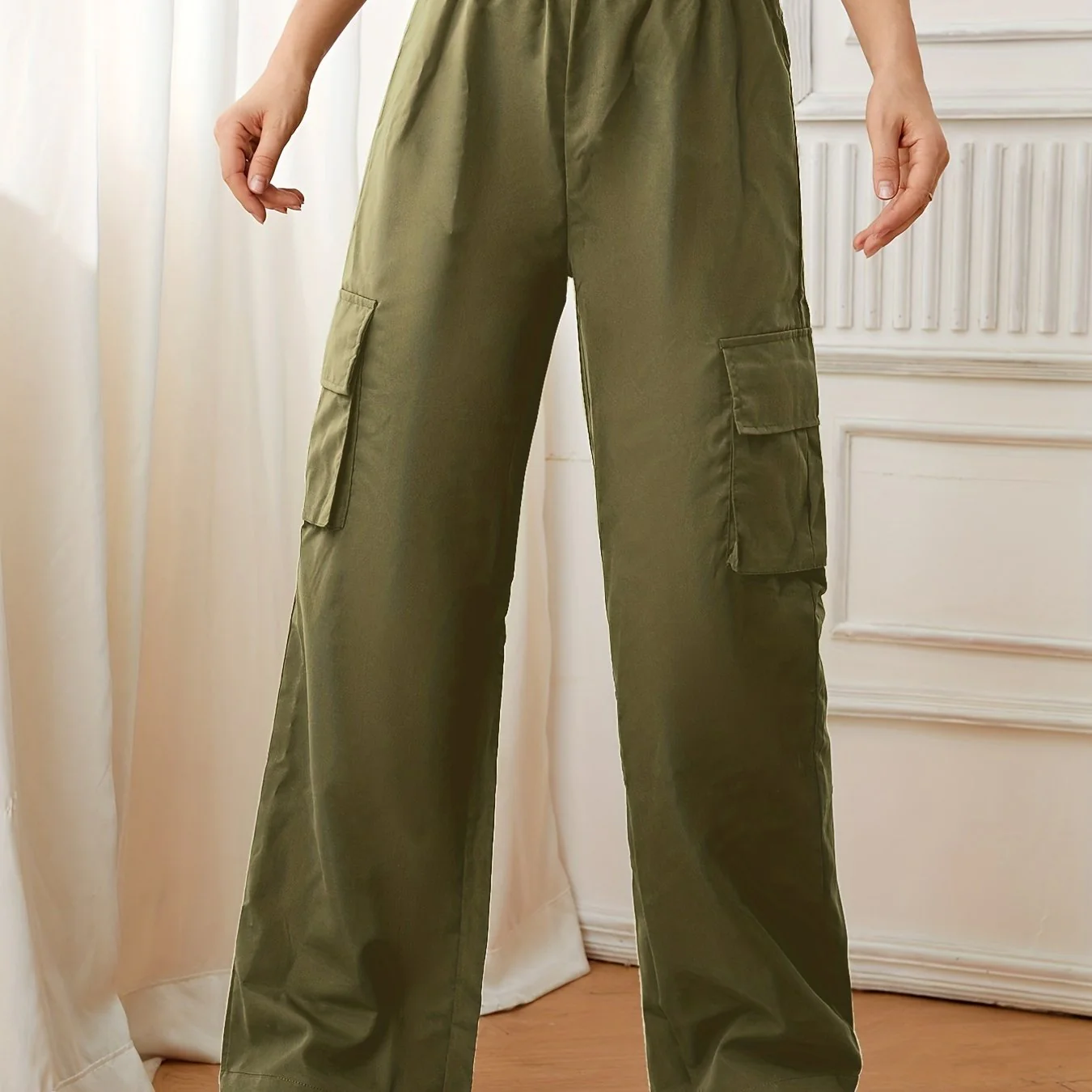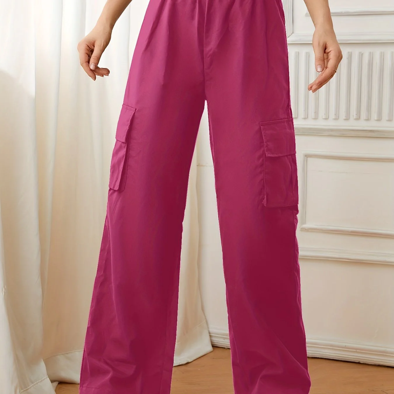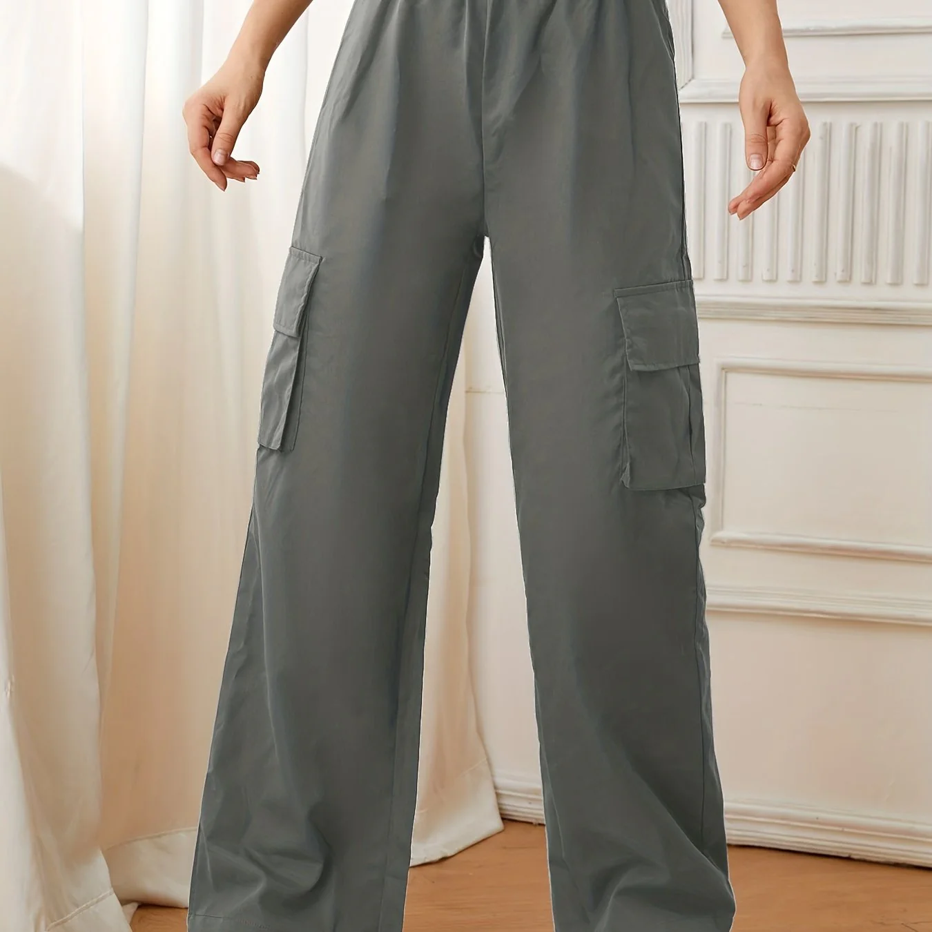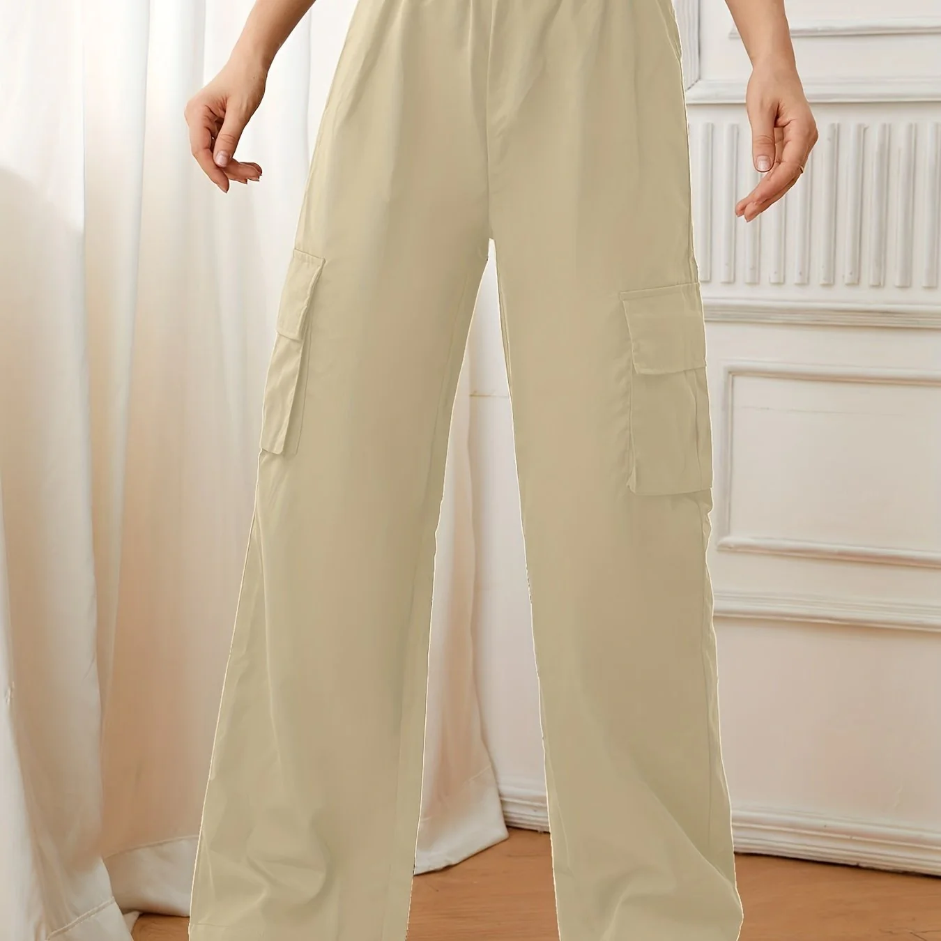 deanwangkt-1 Solid Elastic Waist Pants, Casual Long Length Wide Leg Cargo Pants With Pockets, Women's Clothing