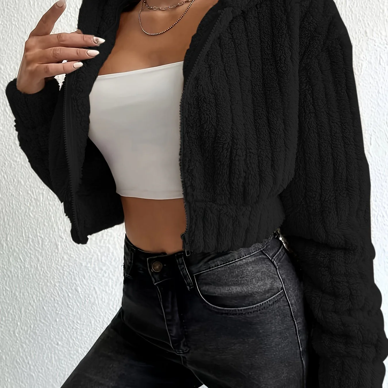 deanwangkt-1 Fuzzy Trim Fall & Winter Jacket, Casual Zip Up Hooded Long Sleeve Outerwear, Women's Clothing