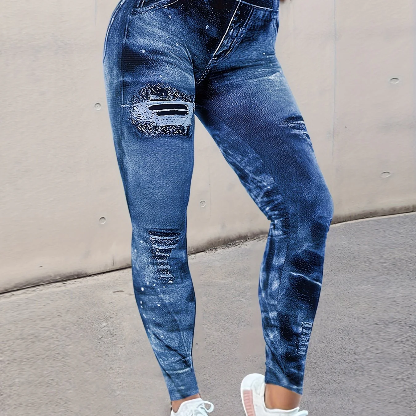 deanwangkt Faux Denim Stretch Sports Leggings, Tummy Control Butt Lifting Workout Running Yoga Tight Pants, Women's Activewear