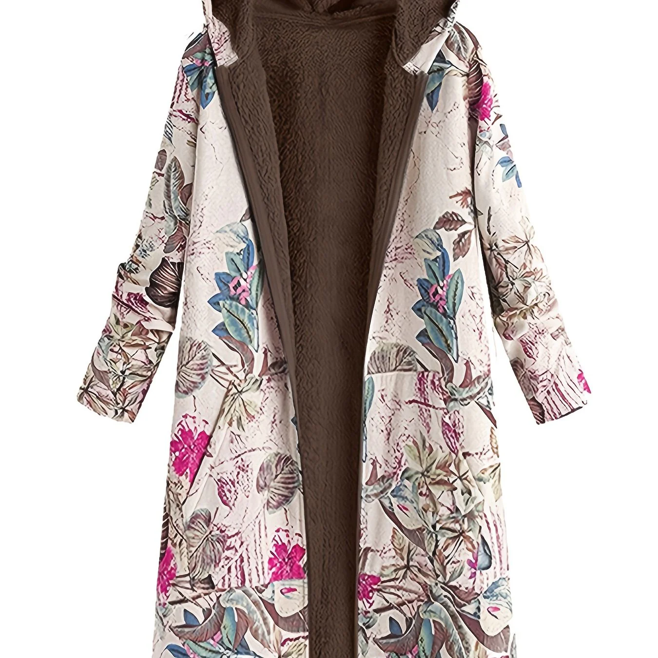 deanwangkt Floral Print Pocket Hooded Coat, Casual Longline Long Sleeve Thermal Coat For Fall & Winter, Women's Clothing