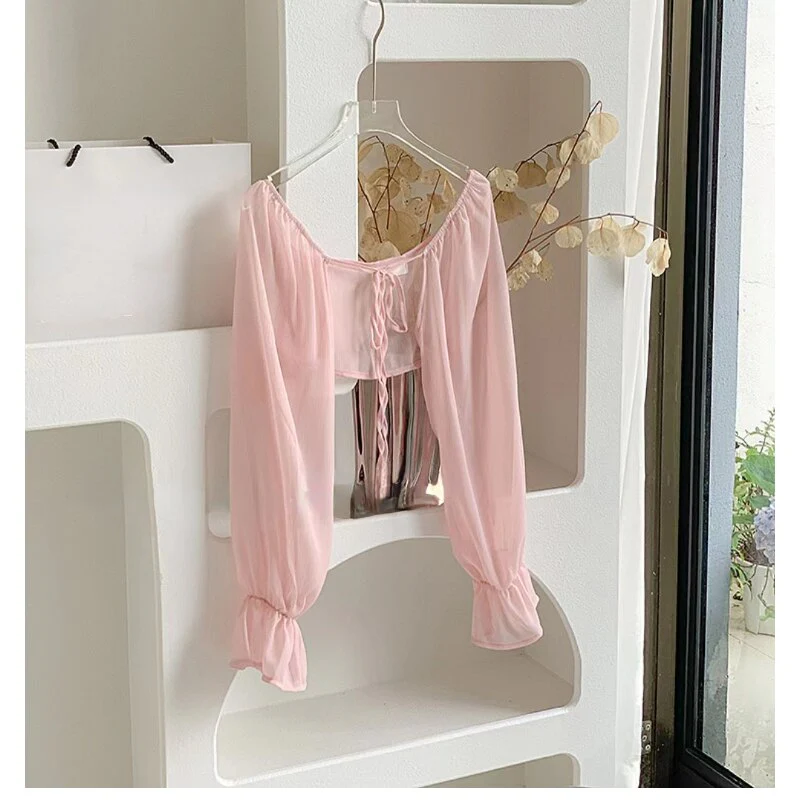 deanwangkt Women Summer Blouses Long Sleeve Top Thin Perspective Shawl Shrug Tops V-Neck Mesh Lace Blouse Female Shirt