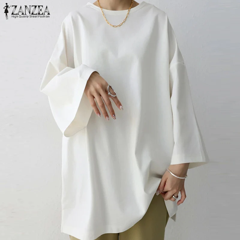 deanwangkt Womens Baggy Solid Blouse ZANZEA Vintage Flare Sleeve Tops Casual Autumn Blusas Female Split Tunic Oversized Chemise