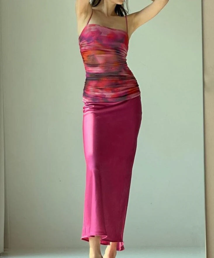 deanwangkt Women Summer Satin Slip Patchwork Mesh Maxi Dress Print Backless Off Shoulder For Women Outfits Beach Holiday Vestido