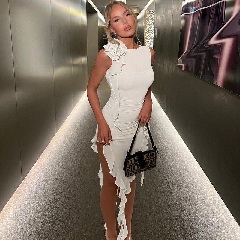 Y2K Ruffles Fairy Dress Women Sexy Mesh See Through Mini Bodycon Dress Summer Rose Red Irregular Beach Party Club Outfits