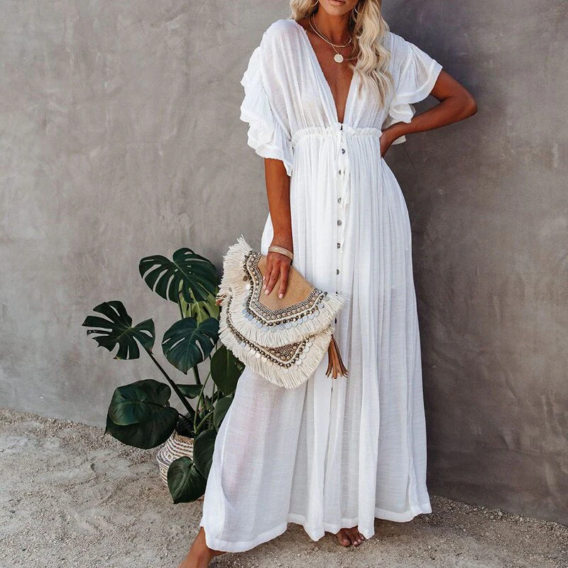 Beach Long Maxi Dress Women Beach Cover Up Tunic Pareo White V Neck Dress Robe Swimwear Beachwear Casual Dresses Vestidos