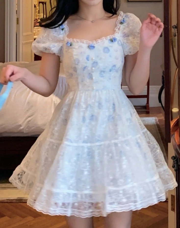 deanwangkt Floral Lace Korean Sweet Dress Women France Vintage Elegant Party Mini Dresses Female Print Casual Beach Boho Fairy Dress Summer