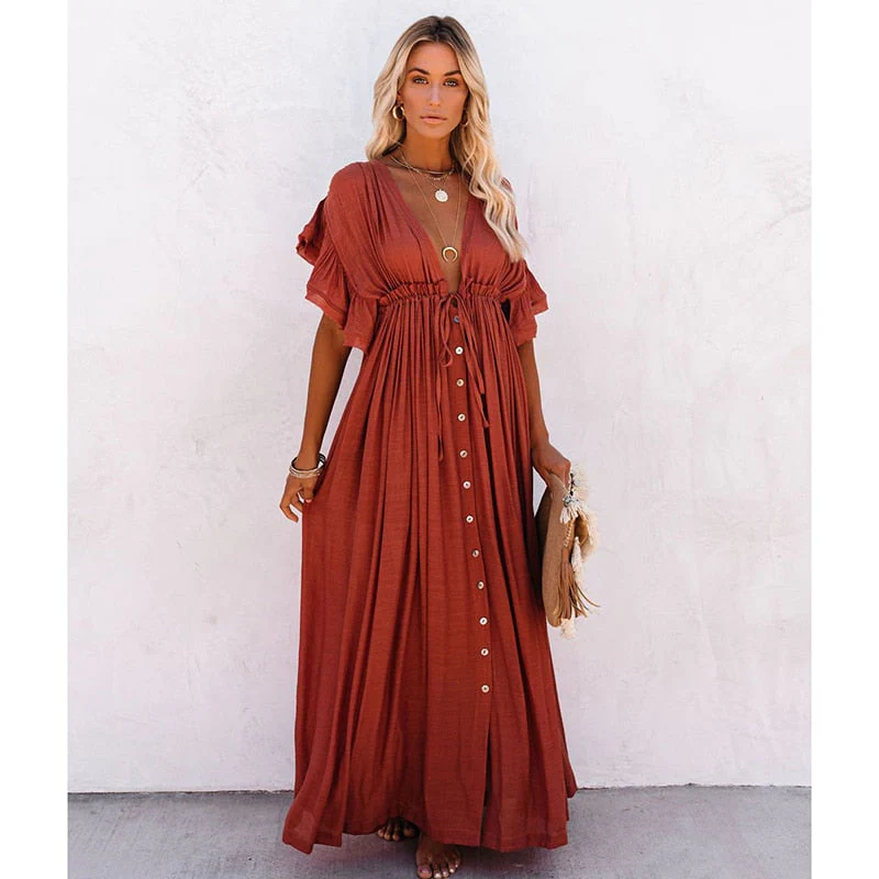 deanwangkt Sexy Boho Dress Beach Cover Up Kaftan Women Long Beachwear Solid V Neck Ladies Holiday Dress Robe Plage Sarong Beach Pareos