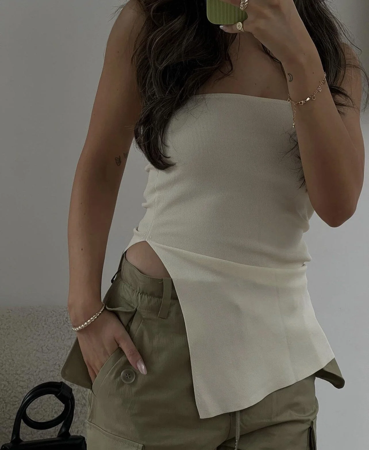 deanwangkt Women Strapless Tops Summer Fashion Irregular Split Slim Tube Top Y2K Sexy Backless Knit Crop Top Vacation Outfit Streetwear
