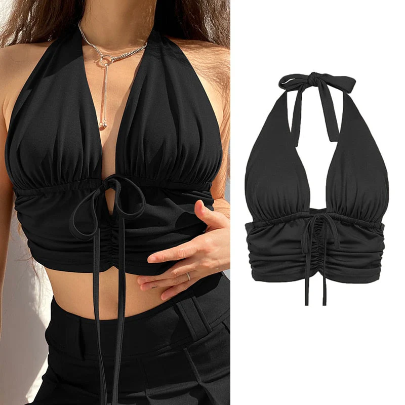 deanwangkt Women Sexy Harajuku Open Back Crop Tops Summer Ladies Bandage Lace-up Backless White Tank Tops High Street Slim Halter Tops