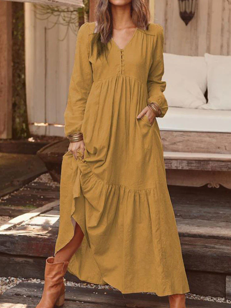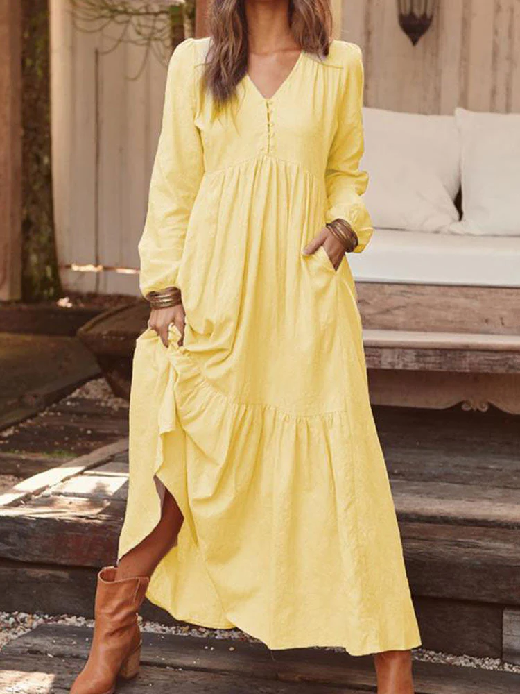 Joskaa Cotton Long Dress Women Retro Solid Color Maxi Dress Lantern Sleeve with Pocket Pleated Casual Dresses V Neck Dress