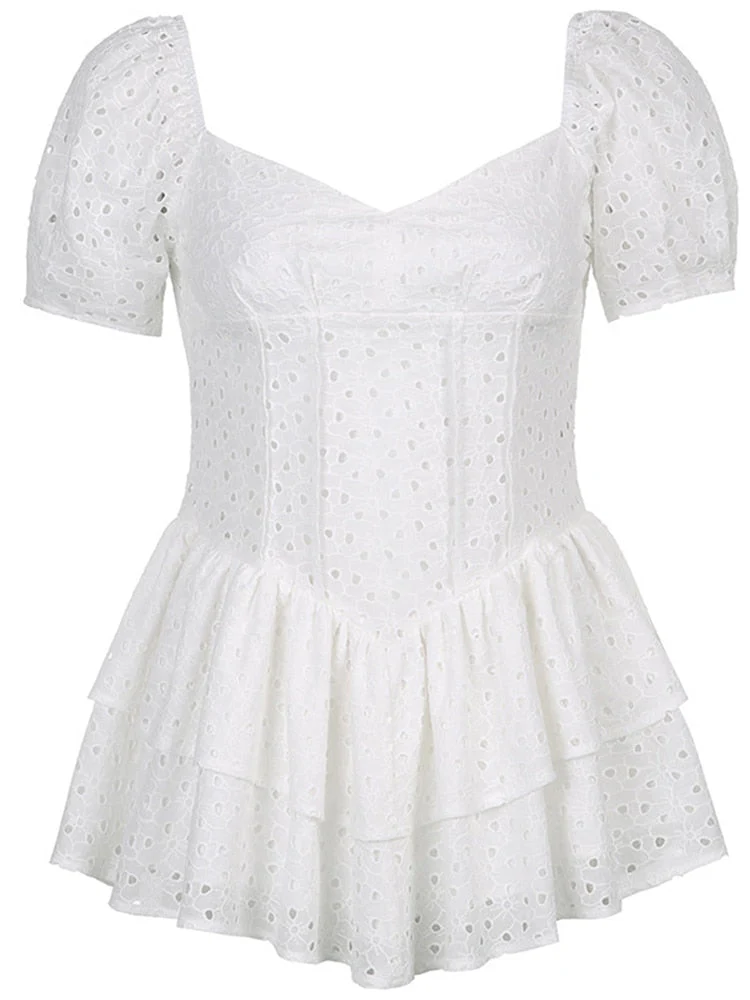 Joskaa Sweet Ruffles Pleated Dress Women Summer Fashion Vintage Puff Sleeve V Neck Mini Dress