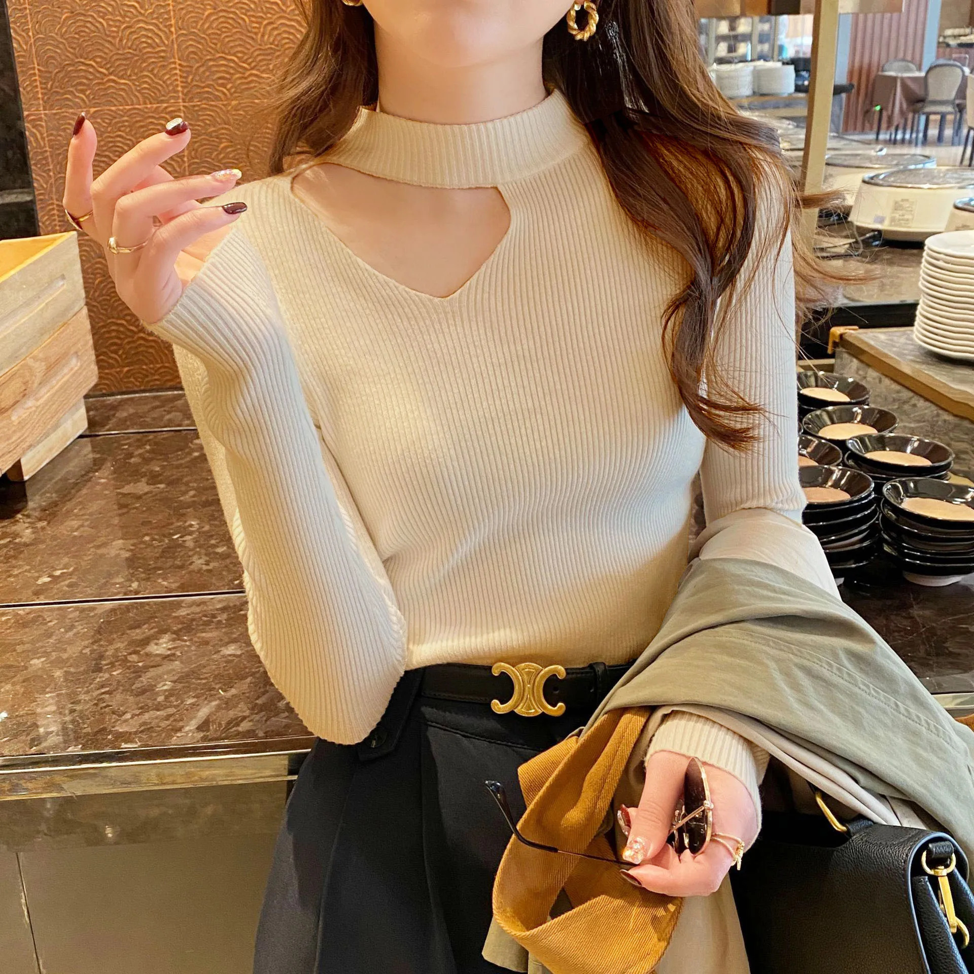 deanwangkt Women Sexy Halter Neck Hollow Out Sweater Solid Full Sleeve Slim Spring Autumn Bottoming Knitted Tops
