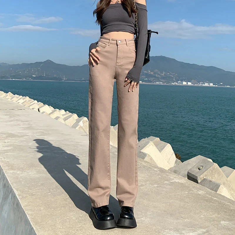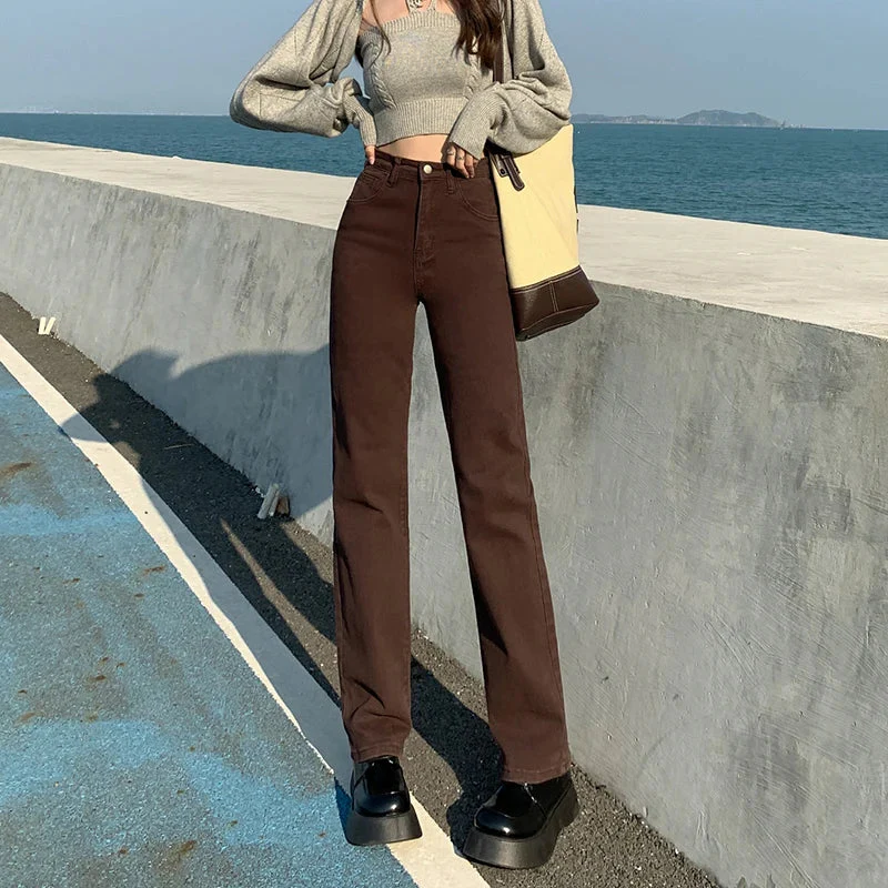deanwangkt Straight Jeans Woman High Waisted Stretch Cotton Denim Khaki Pants Vintage Streetwear Brown Y2k Fashion Jeans Female