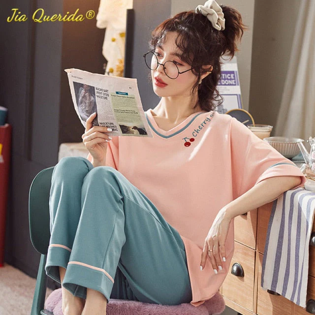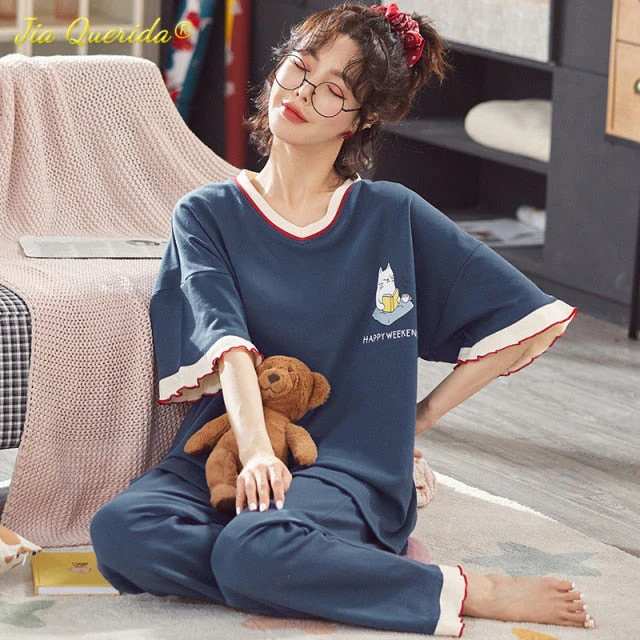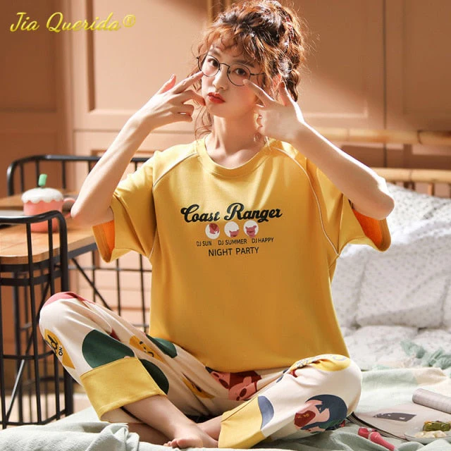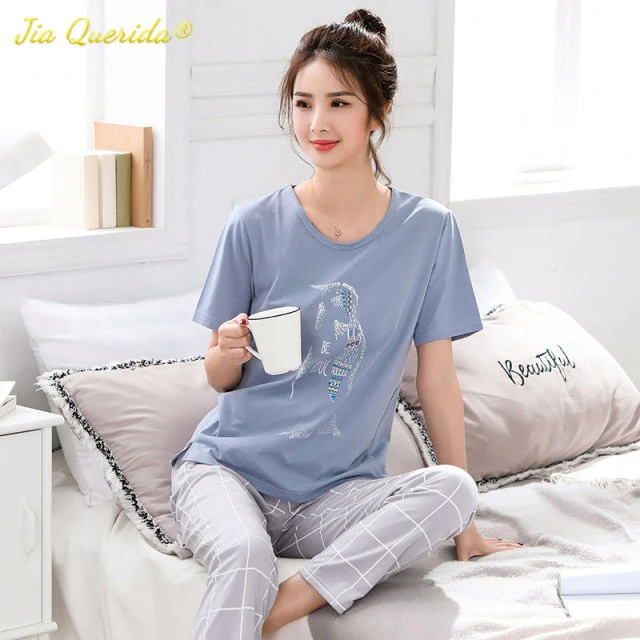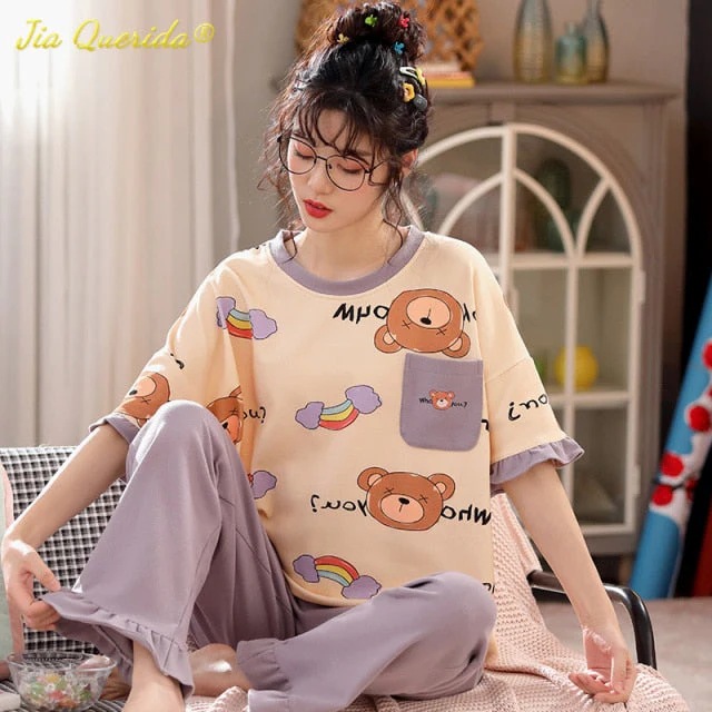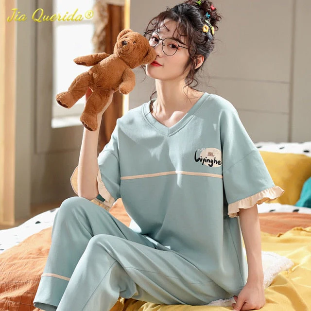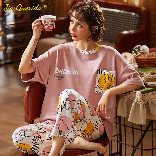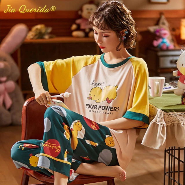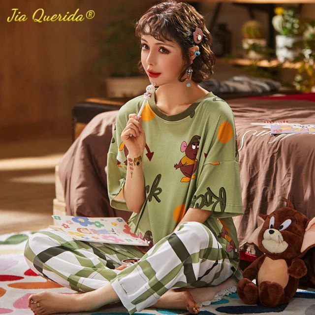 deanwangkt Summer Home Clothing M-5XL Big Size Ladies's Pajamas Green Patchwork Sleeves Cartoon Printing Plus Size Women's Sleepwear