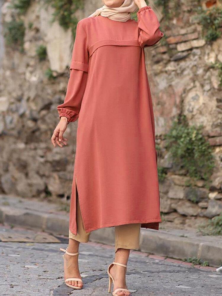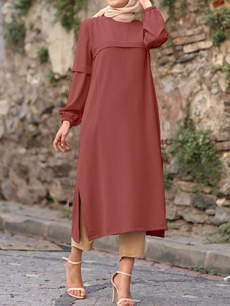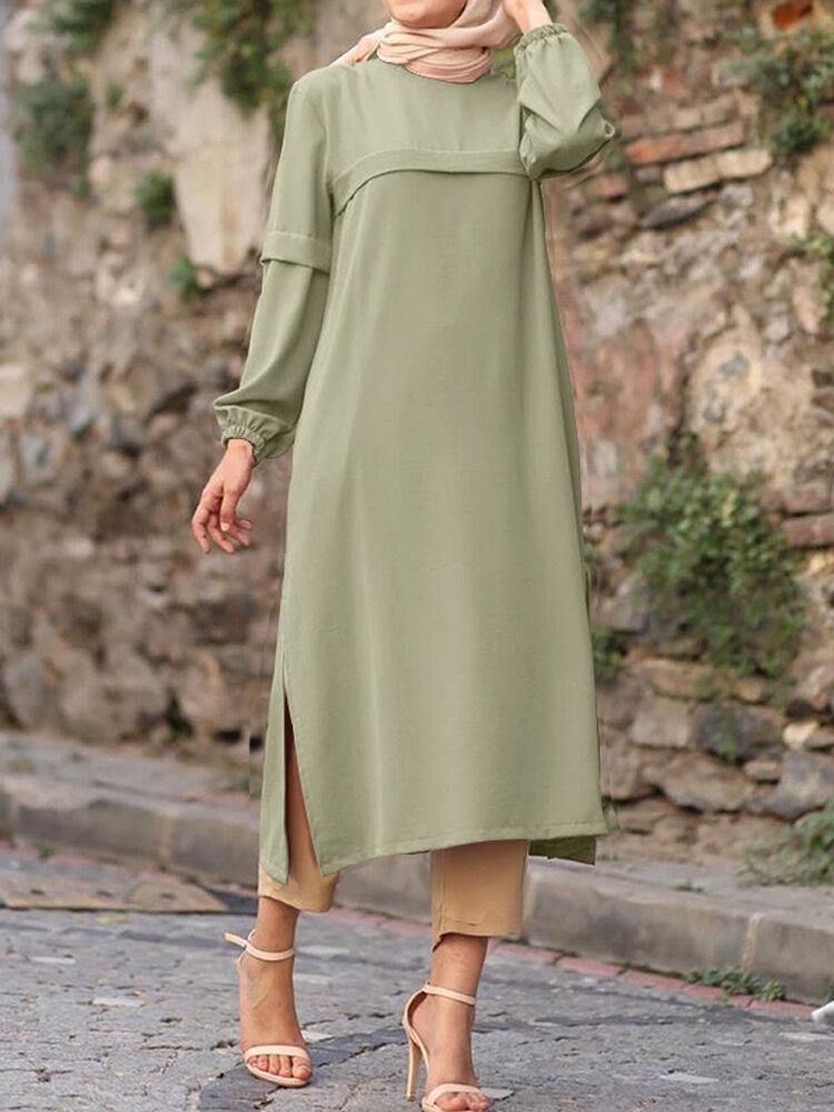 deanwangkt Women Solid Color Puff Sleeves Side Silt Elastic Cuffs O-Neck Casual Midi Dress