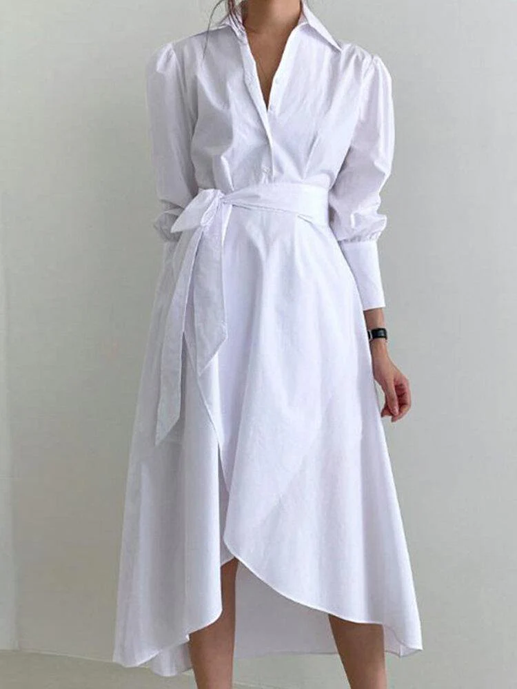 deanwangkt Women Vintage Irregular Hem Lapel Solid Color Cotton Lace-Up Long Sleeve Dress