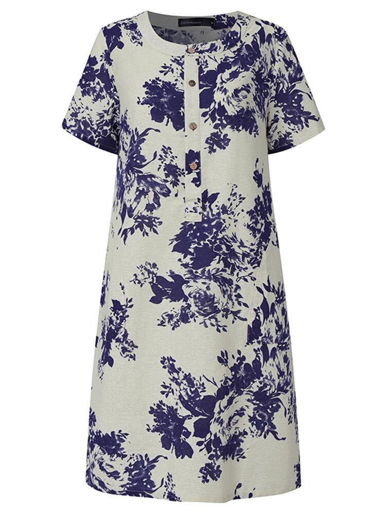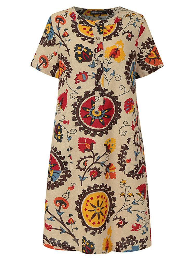 deanwangkt Women Ethnic Style Floral Print Short Sleeve Half Button Front Vintage Dresses