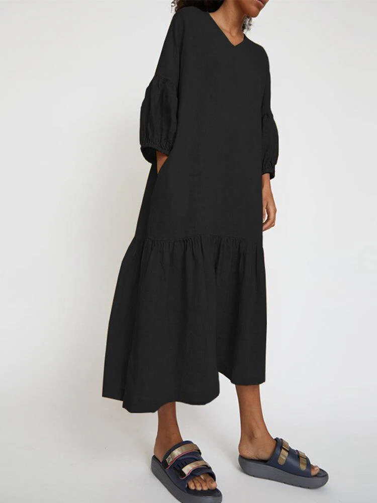 deanwangkt Women 100% Cotton V-Neck Puff Sleeve Stylish Solid Color Drop Shoulder Ruffle Hem Midi Dress
