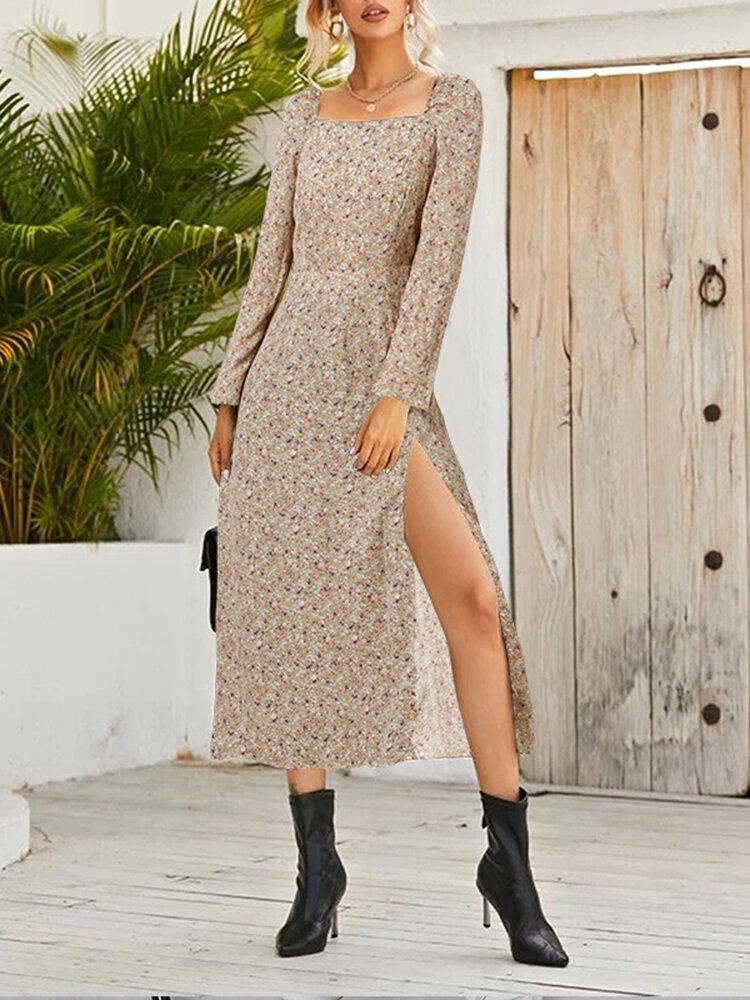 deanwangkt Women Square Neck High Split Floral Print Long Sleeve Casual Slim Fit Midi Dress