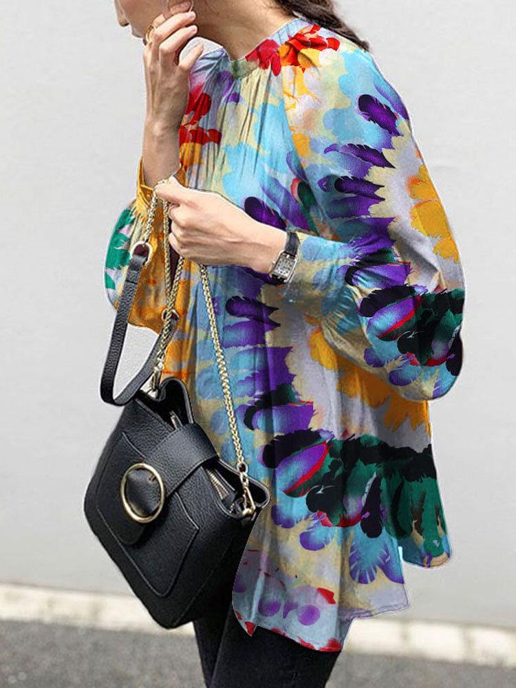 deanwangkt Calico Print O-neck Long Sleeve Irregular Hem Blouse For Women