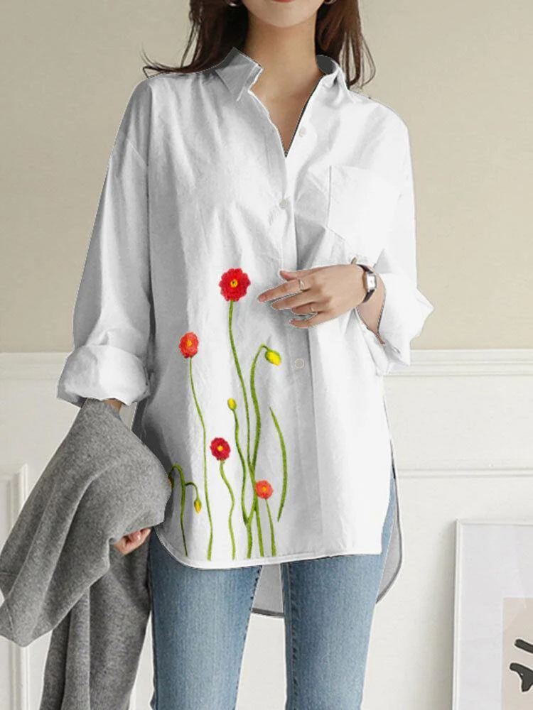 deanwangkt Women Flowers Embroidery Plain Lapel Long Sleeve Side Split Casual Blouse