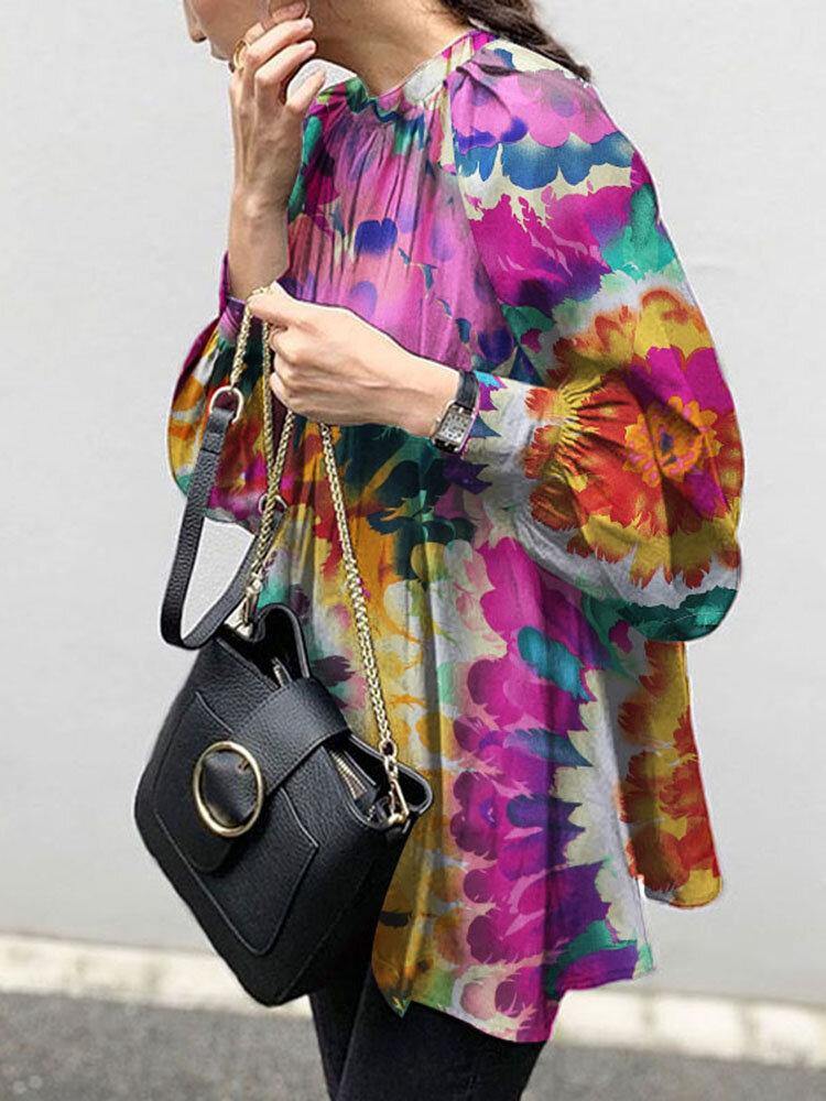 deanwangkt Women Colorful Flowers Printing Puff Sleeve Back Button Casual Blouse
