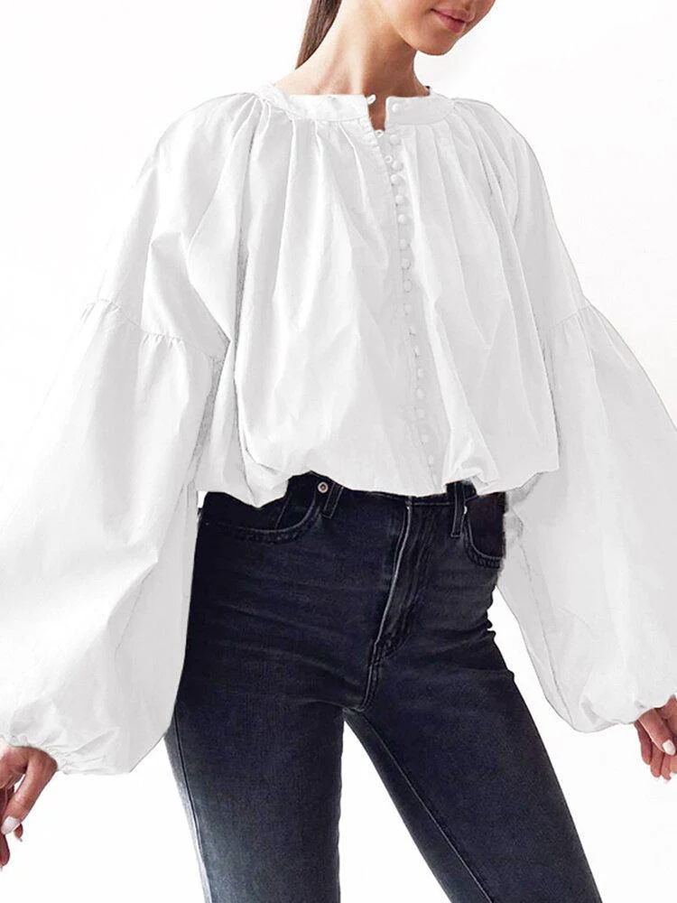 deanwangkt Puff Sleeve Casual Solid Color Button Up O-Neck Pleated Stylish Blouse For Women
