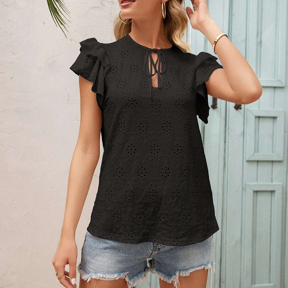deanwangkt Women Shirts Blouse Butterfly Sleeve Hollow Out Tops Casual Female O-neck Ladies Blouses Purple Pink Yellow Color Woman Tops