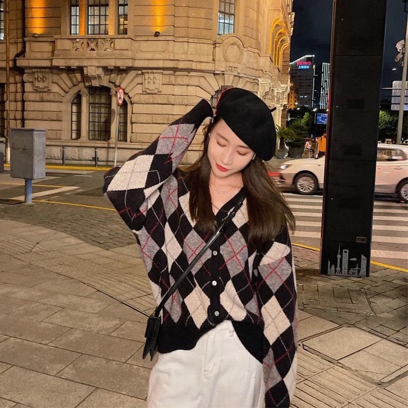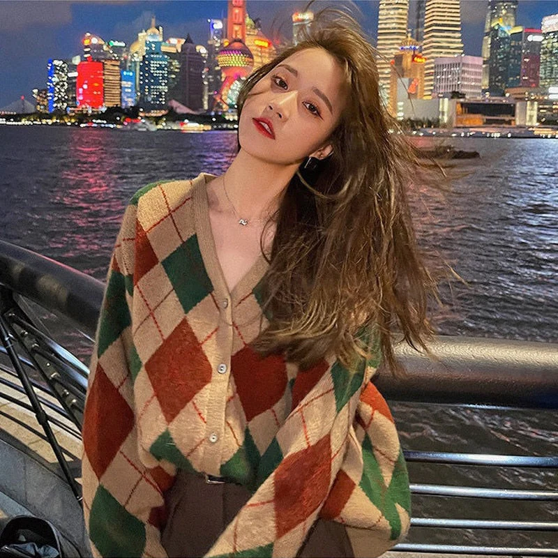 deanwangkt Winter Jacket Sweater Women Argyle Loose Cardigan Vintage V Neck Knit Sweater Fall College Warm Cardigan Sweet Fashion Coat