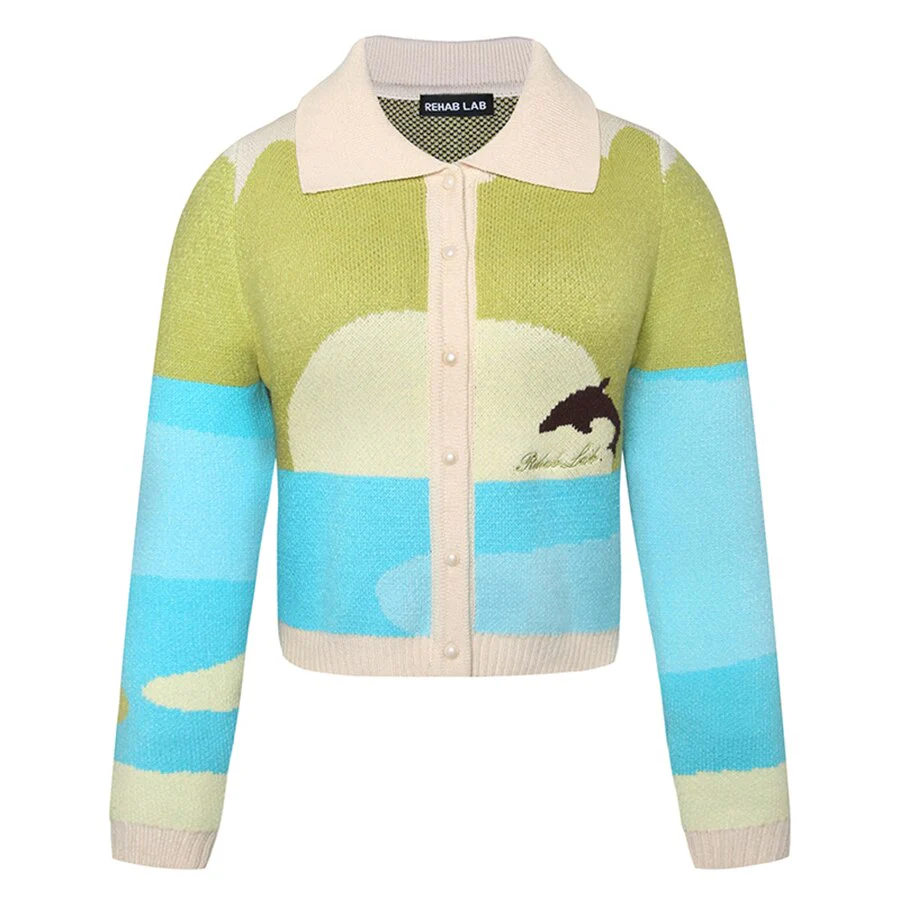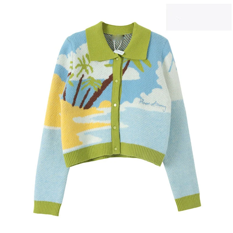 deanwangkt Women Winter Cardigans With Turn-Down Collar Seaside Scenery Print Long Sleeve Knitted Outwear Green Yellow Coat