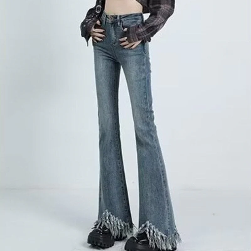 deanwangkt Women's Spring And Autumn New Vintage Blue Tassel Elastic High Waist Slim Horseshoe Pants With Rugged Edge Micro Horn Jeans