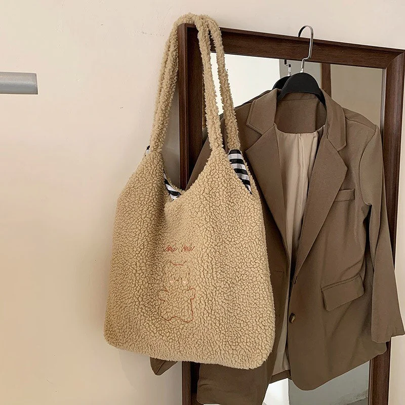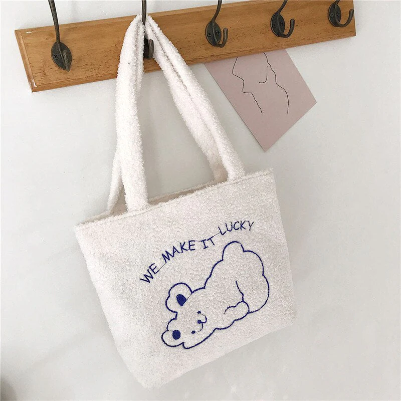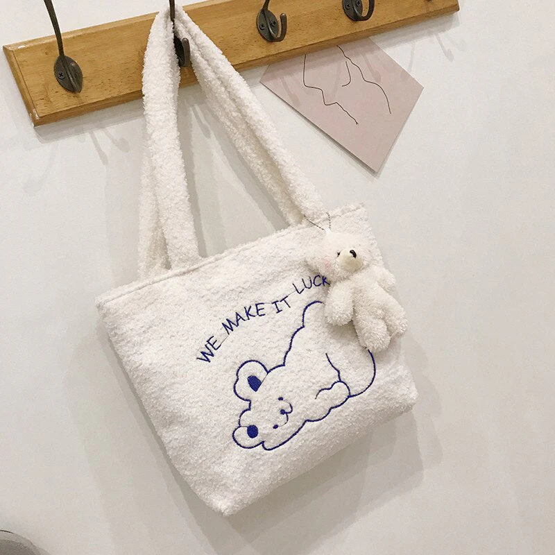 deanwangkt Art Design Japanese Plush Shoulder Bag Women Cartoon Bear Embroidery Handbags Large Capacity Tote Bags Faux Lamb Wool Bag Bolso