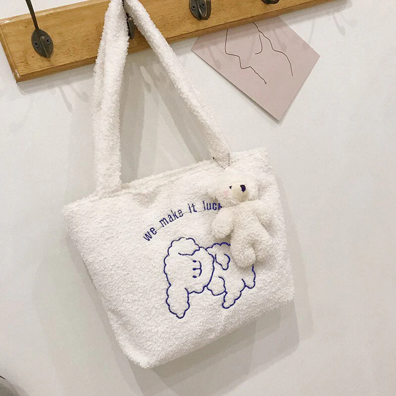 deanwangkt Women's Bag New Plush Tote Bag For Women Cartoon Embroidery Handbag Women Shoulder Bag Shopper Bag Winter Bags Bolsa Mujer