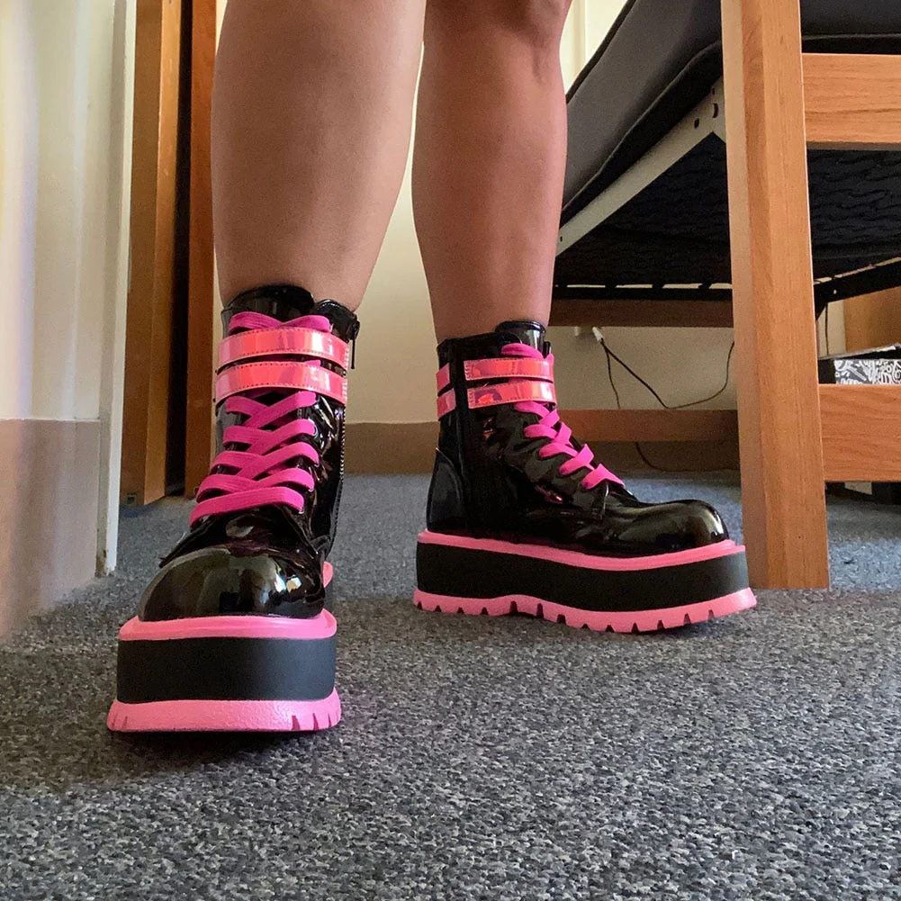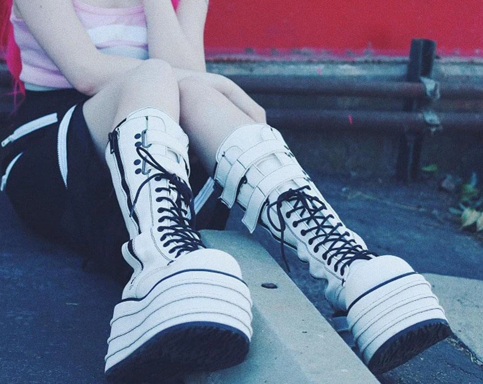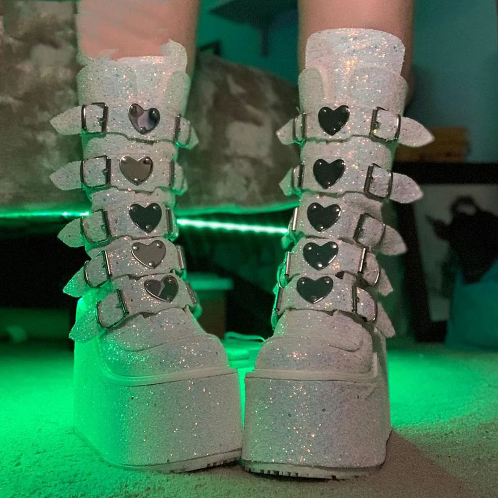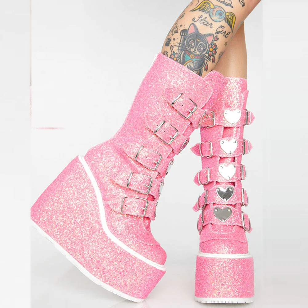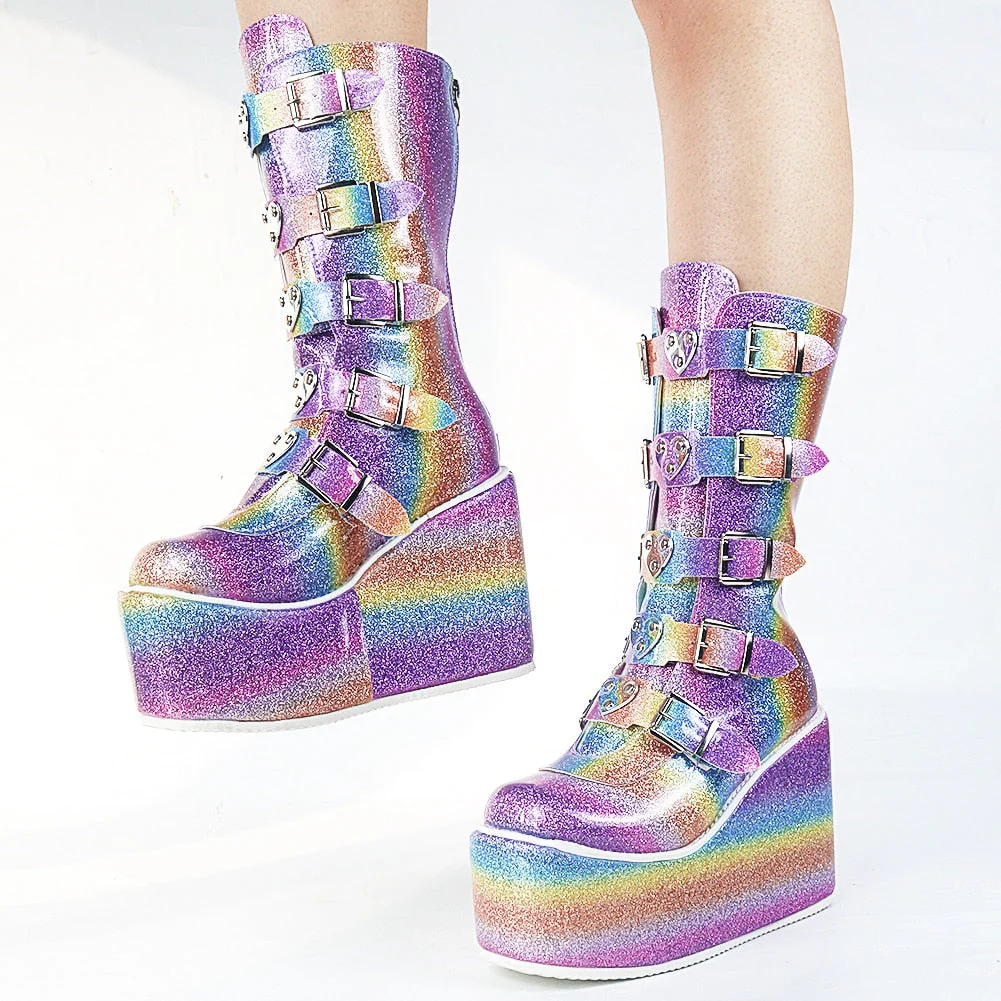 DEANWANGKT Band Goth Platform Wedges Punk Chunky Mid Calf Boots Women Thick Heel Autumn Trendy Cosplay Casual Shoes Women
