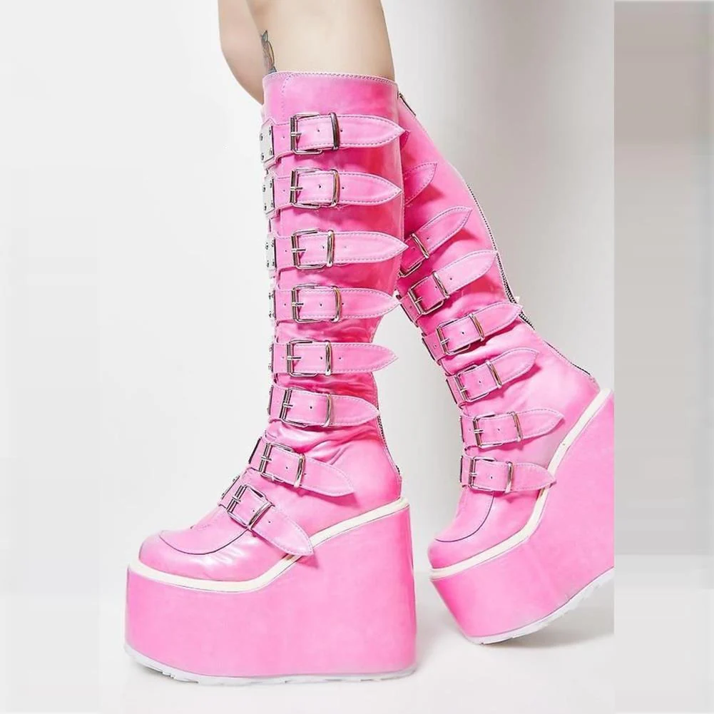 DEANWANGKT High Wedges Buckle Zipper Women Boots Punk Cool Street Thick Heel Shoeslace Autumn Ladies Shoes