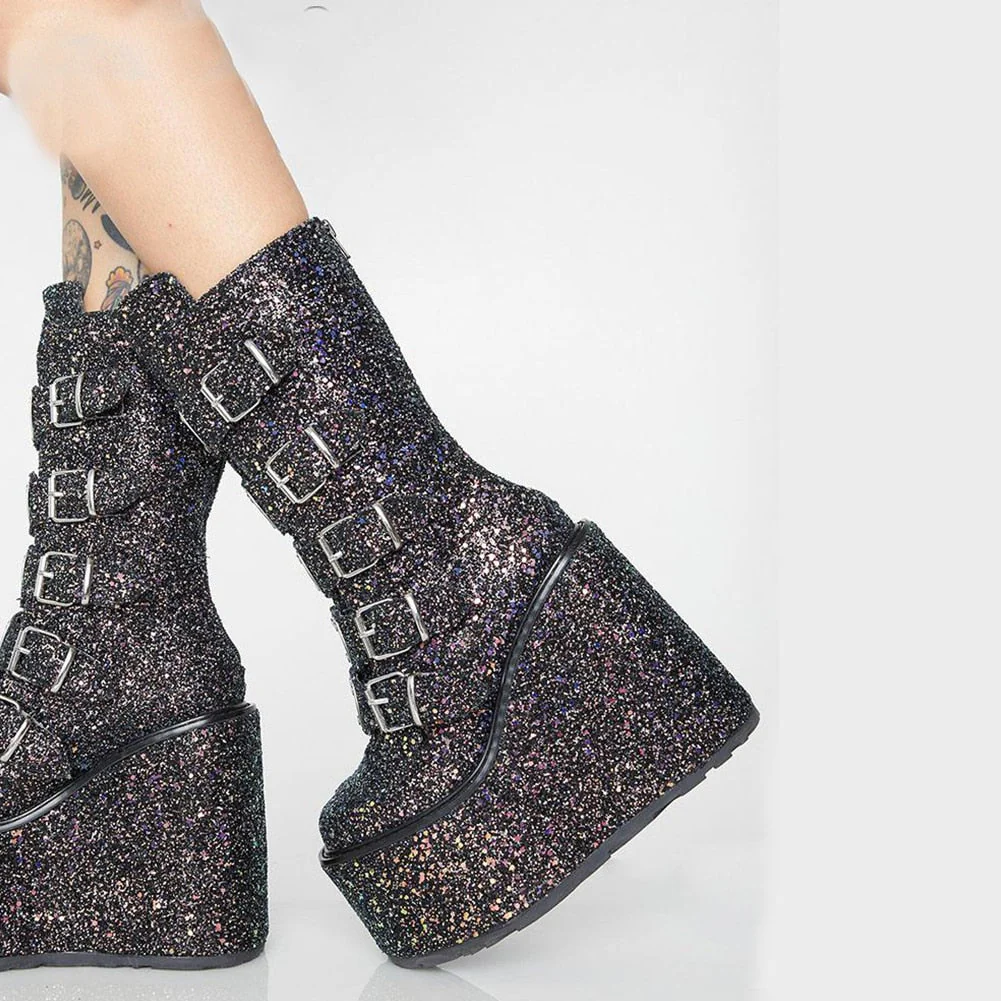 DEANWANGKT Platform Wedges Combat Women Boots Sequins Sequin Glitter Zipper Punk Cool Motorcycle Ladies Shoes